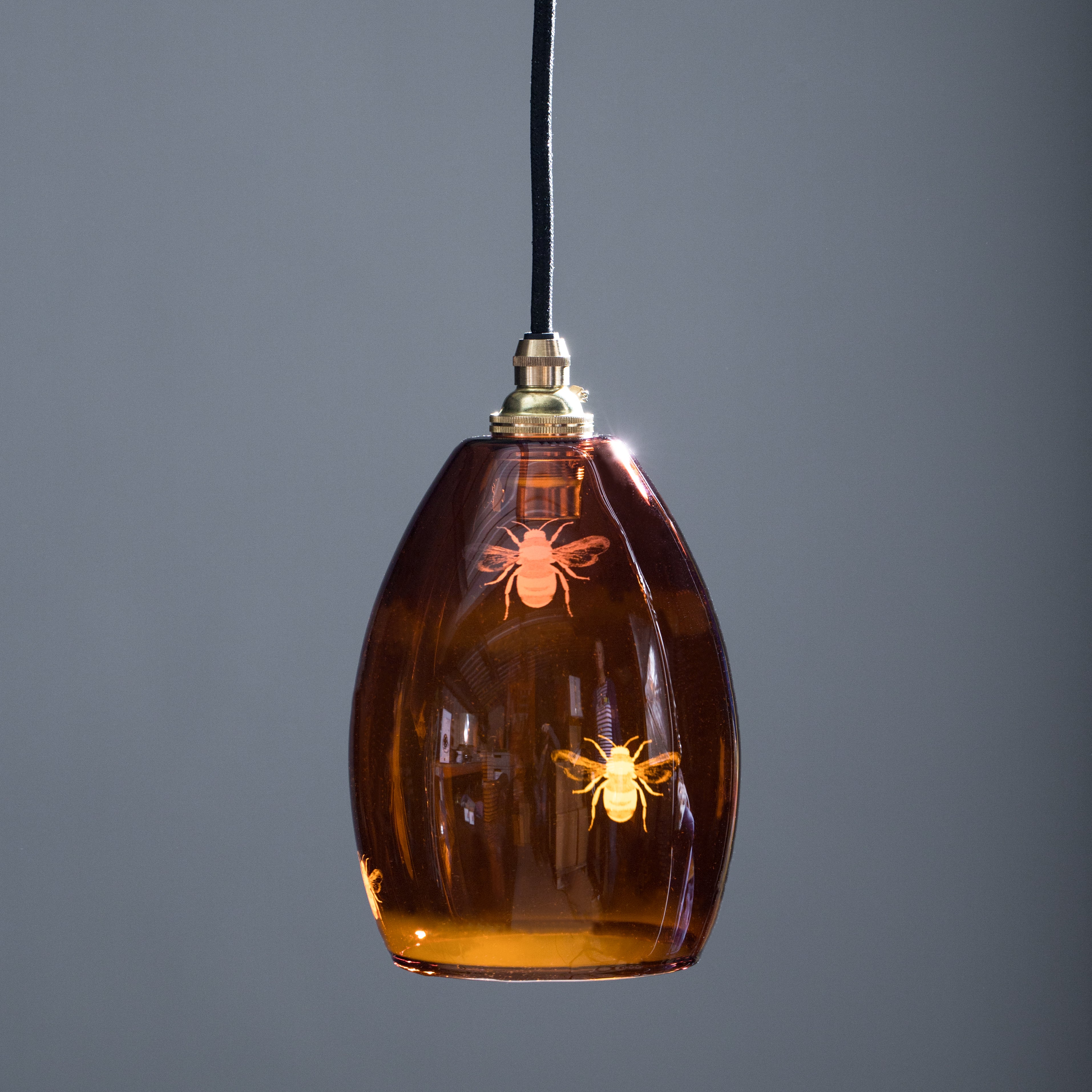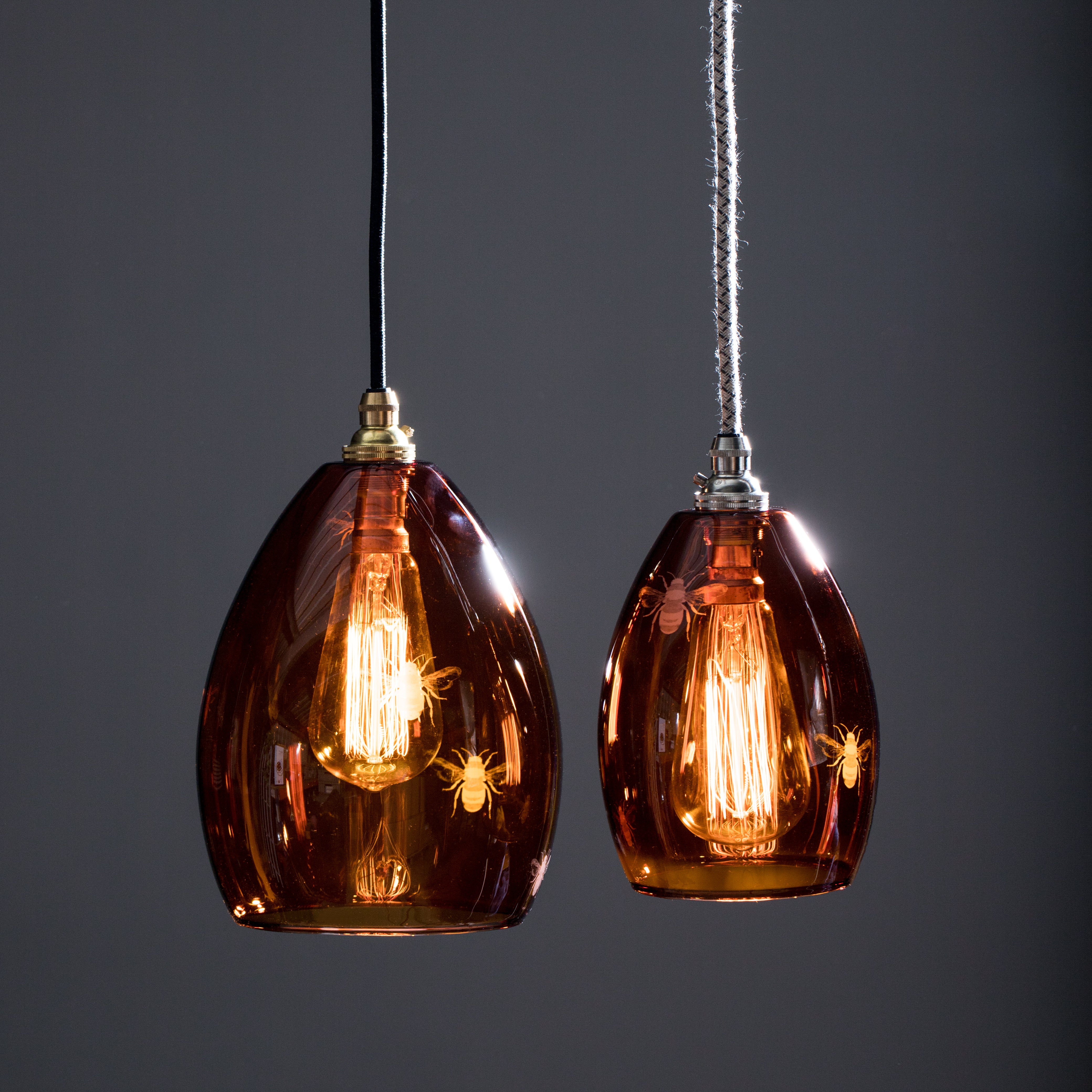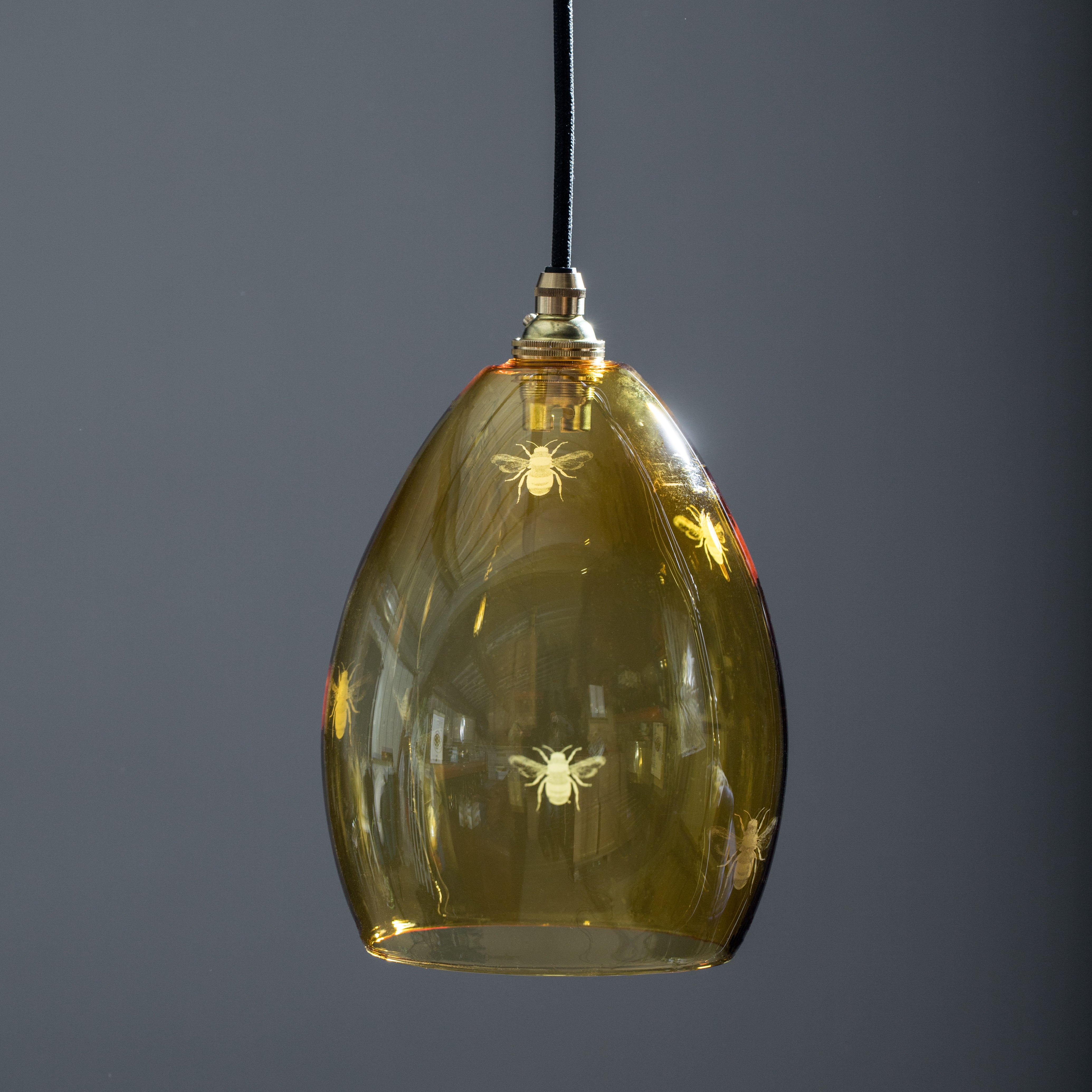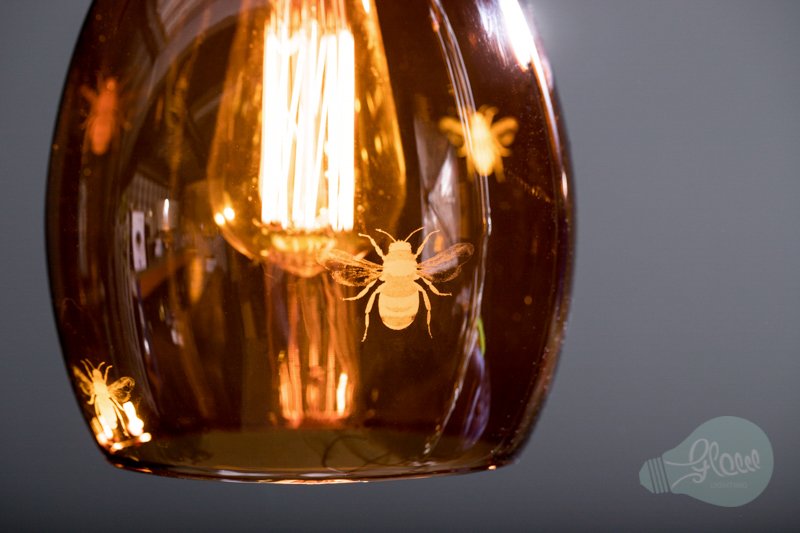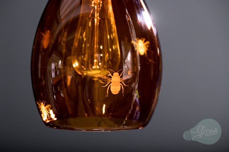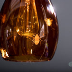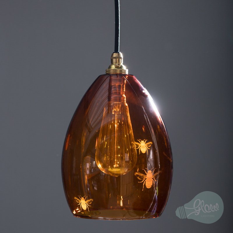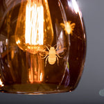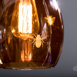 Our Jules Coloured Glass Pendant Light Etched with Bees. Immerse your space in the warm glow with our nature-inspired pendant light.