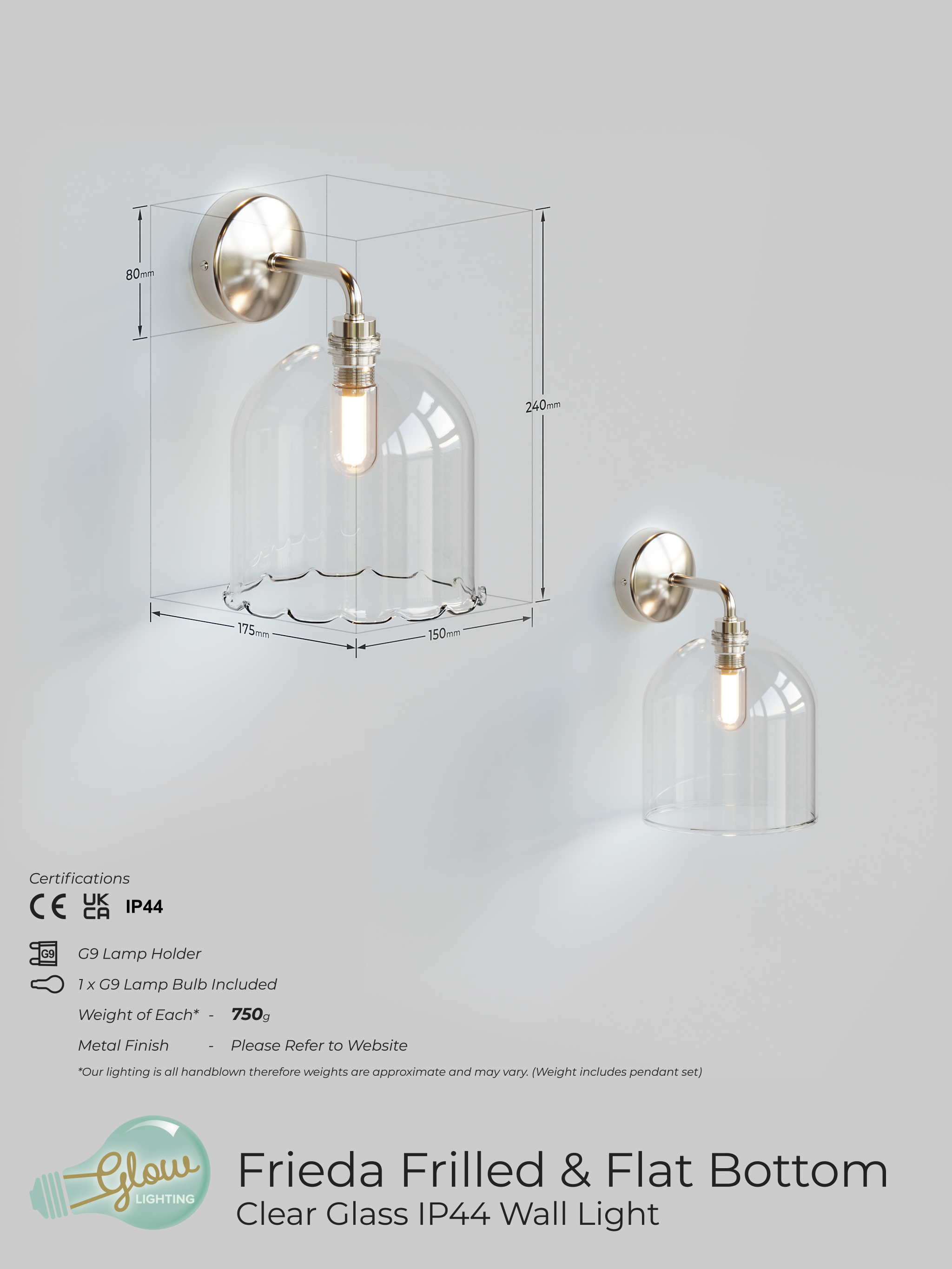 Designed by Glow, the Frieda IP44 Bathroom Wall Light features a delicate handblown clear glass shade with a pretty frilled edge bringing a soft, relaxing glow to your bathroom.