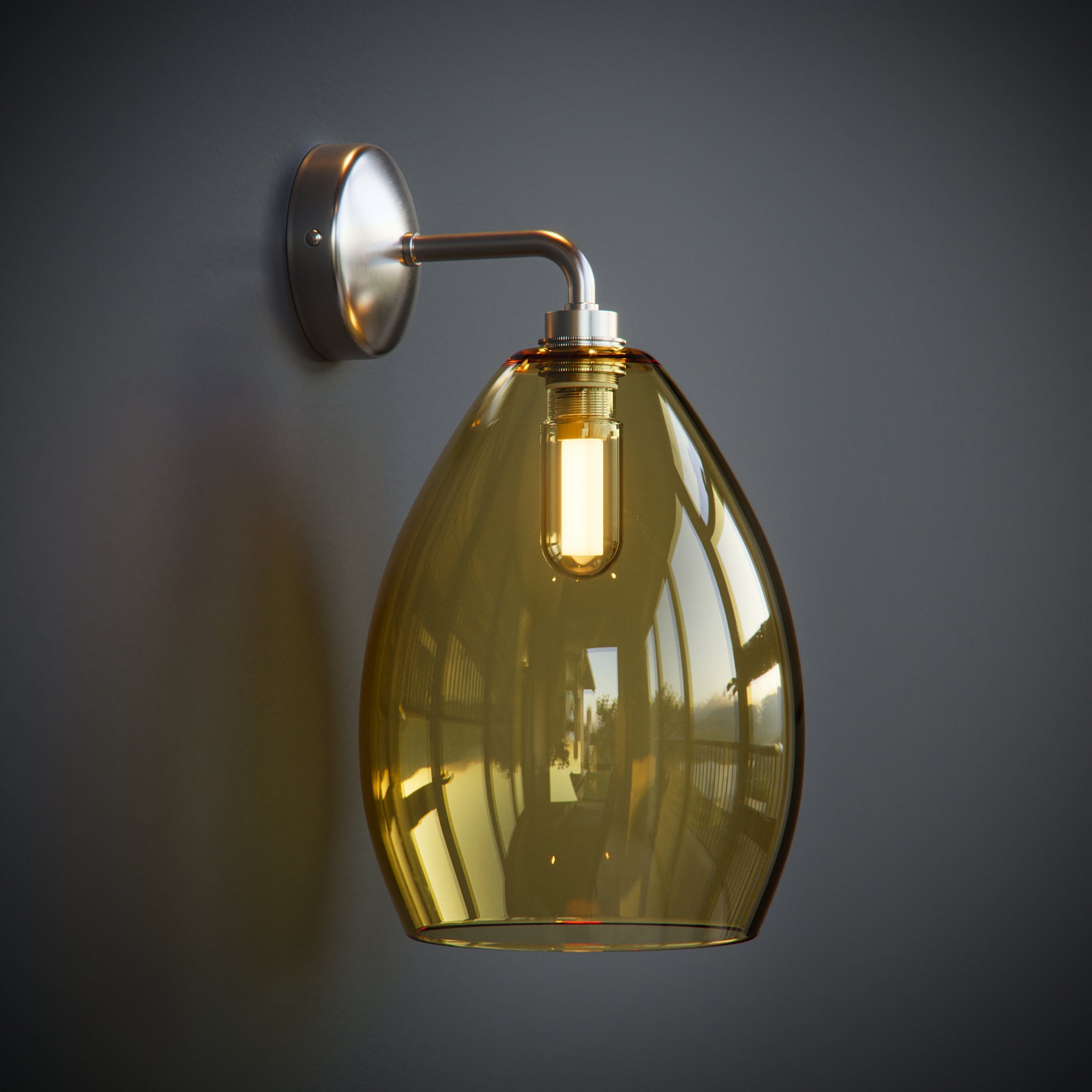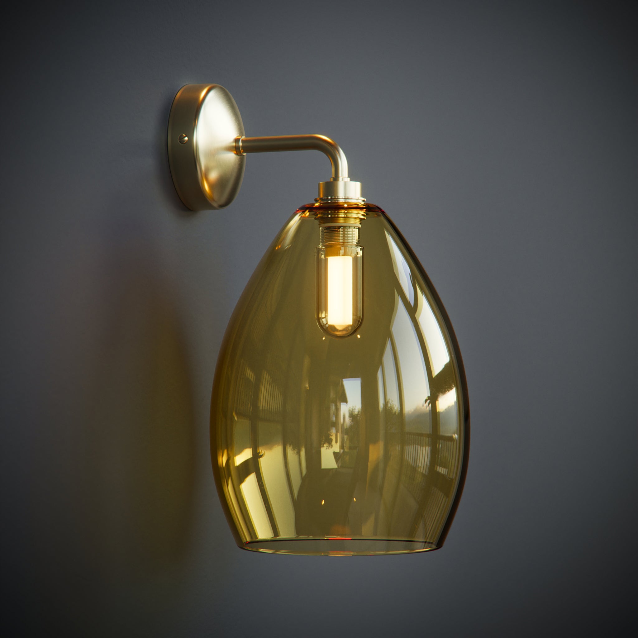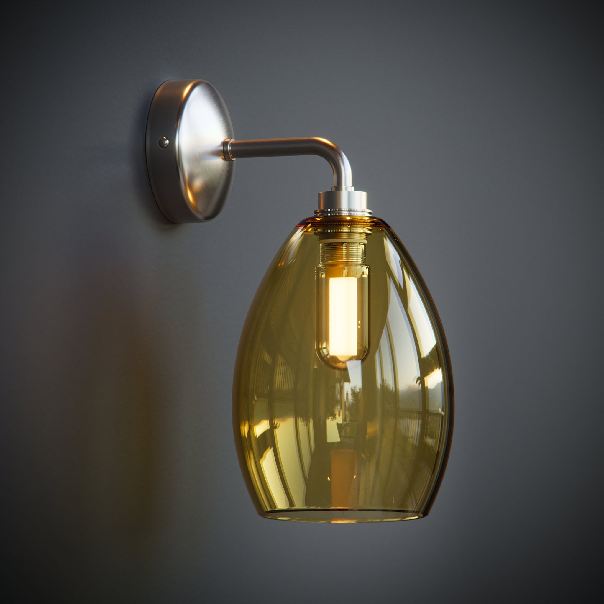 Glow designed, IP44 rated bathroom wall lights. Our yellow hand blown shade creates an warm relaxing glow in your bathroom, adding a touch of effortless glamour. Handblown in our in-house glass blowing studio, bracket handmade in the UK. Available in brushed brass, brushed nickel, antique brass or bronze, perfect for period and contemporary interiors alike.