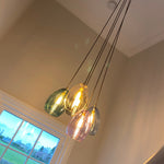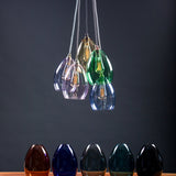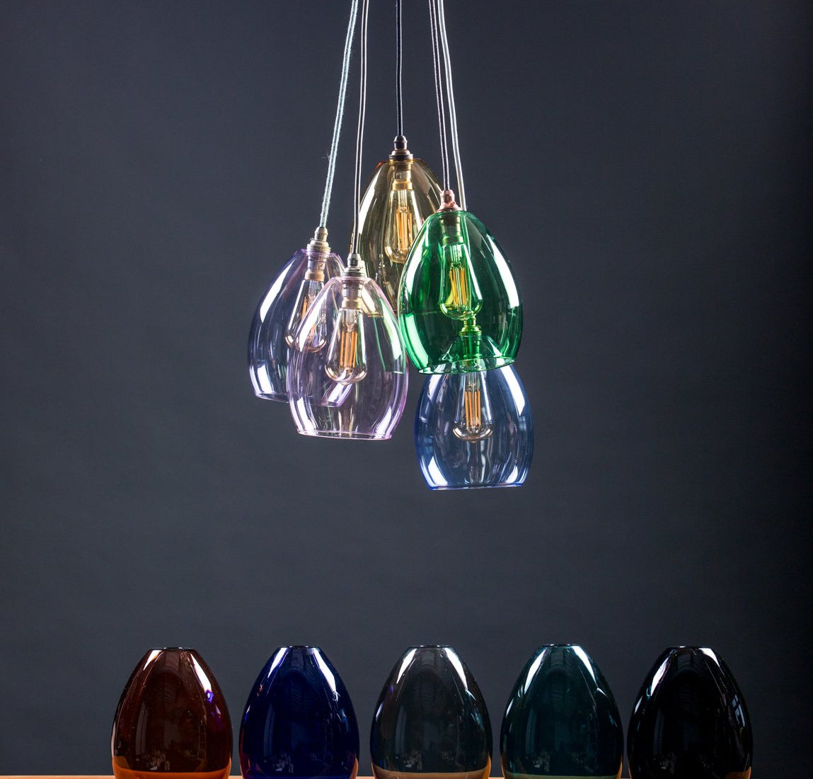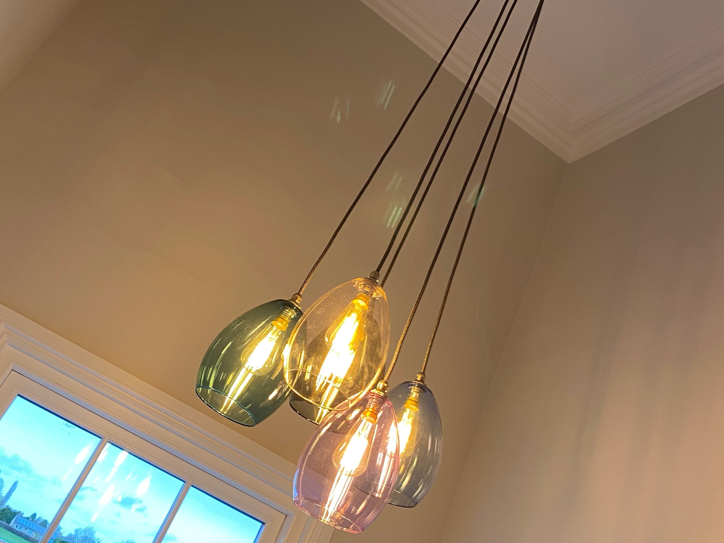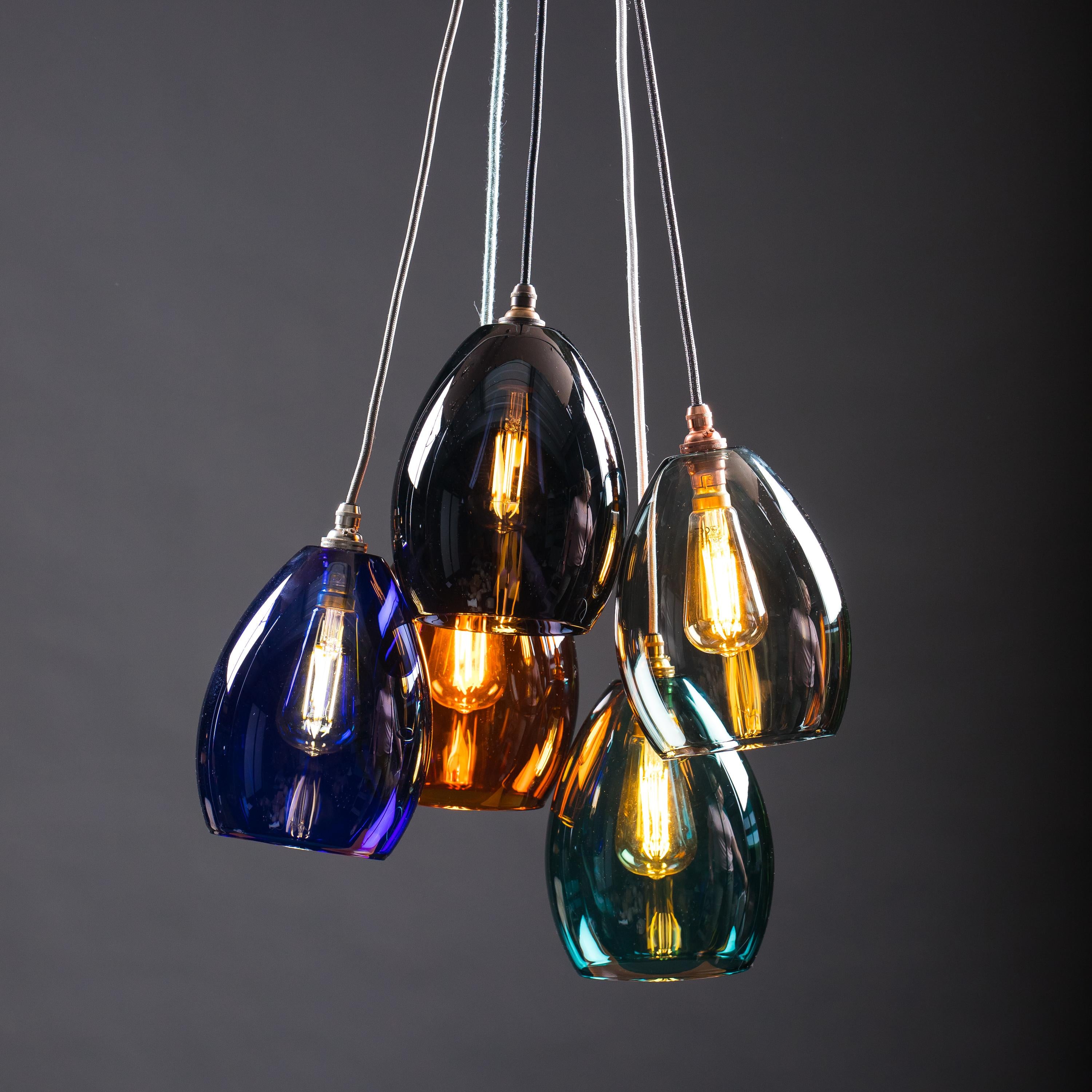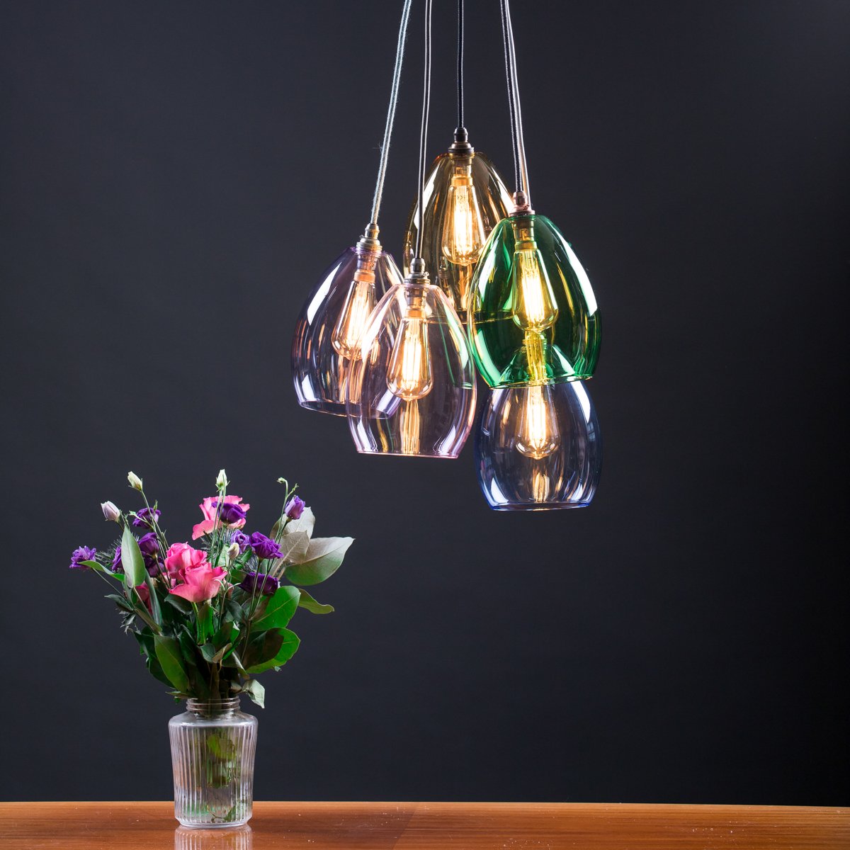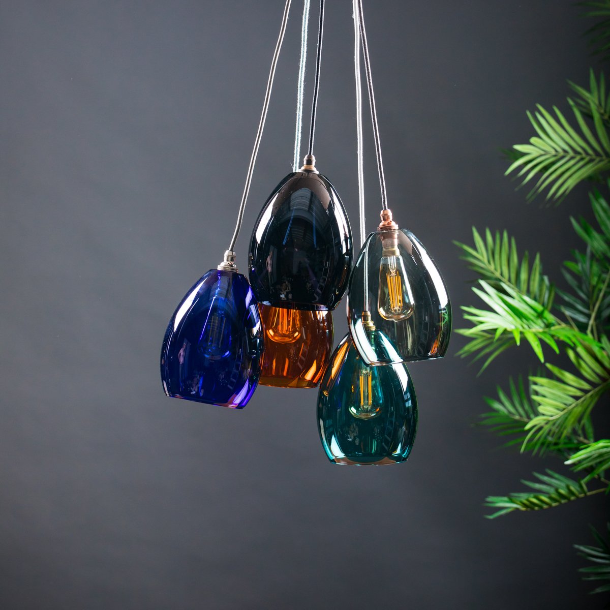 Our 5-Way Coloured Glass Cluster Pendant Light is expertly handblown in our Glow Glass Blowing Studio in North Yorkshire. Designed and made in Britain, this statement piece features five individual glass shades, available in a carefully curated palette of colours including Smoke Grey, Pink, Pale Blue, Lilac, Lime Green, Yellow, Green, Opal, Amber, Dark Blue, and Teal.