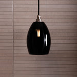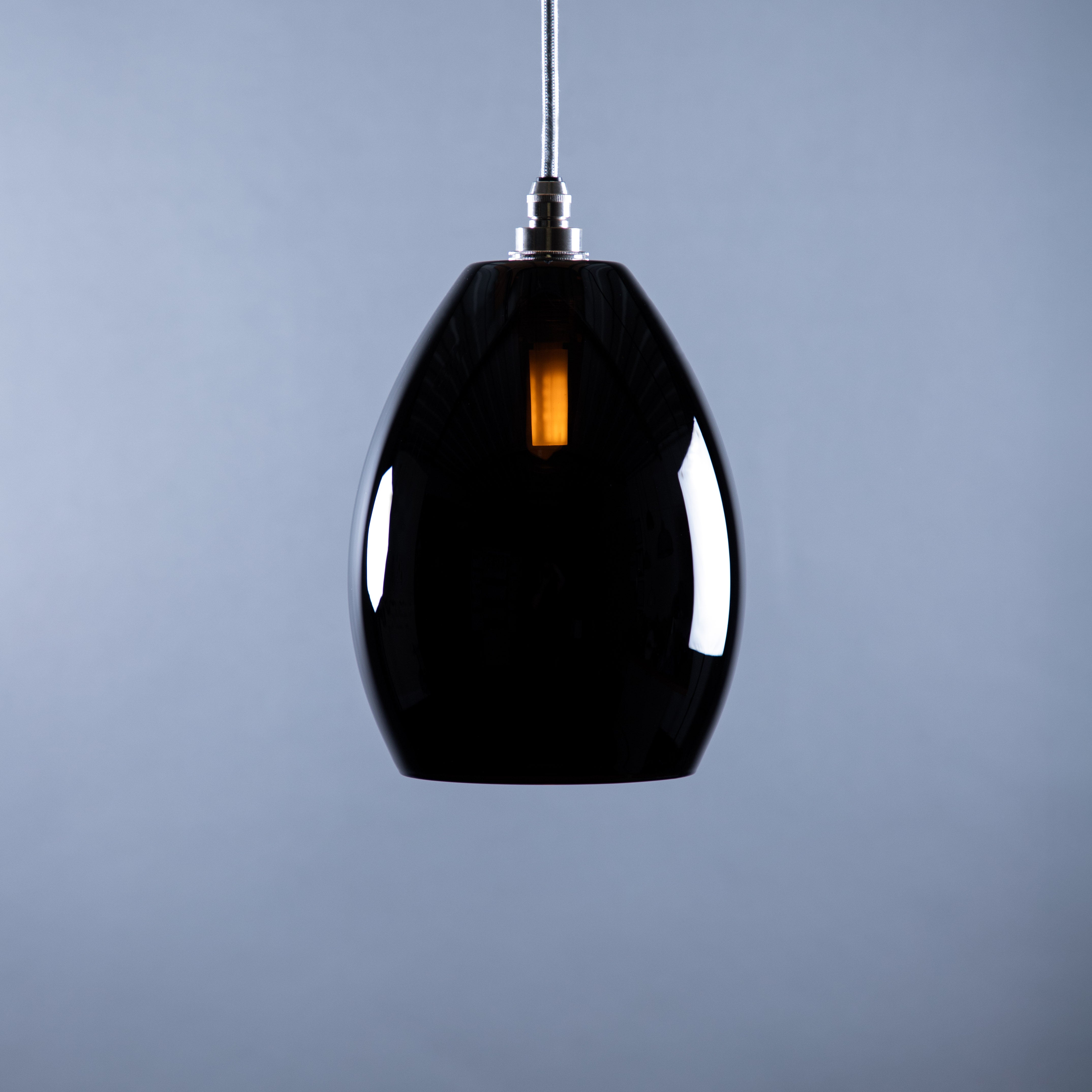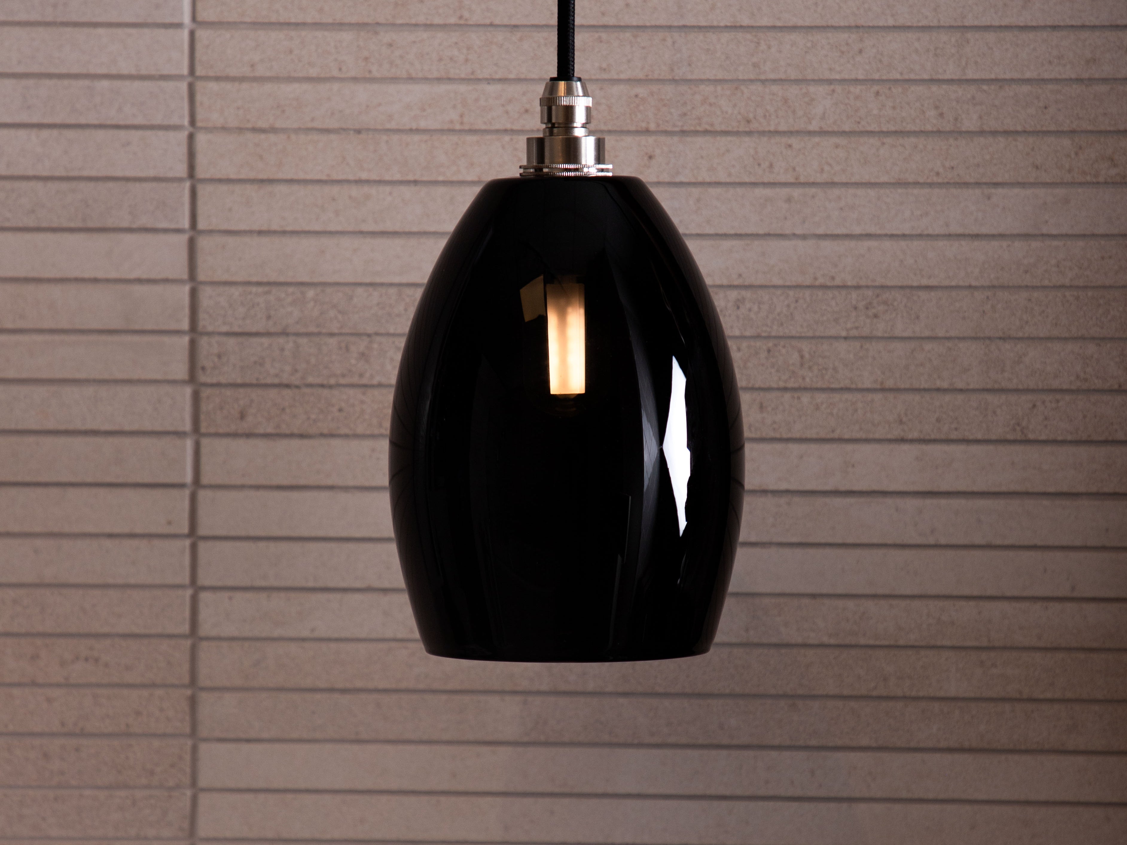 Glow designed, IP44 bathroom pendant lights. Our simple, classic inky black glass Jules shade creates an elegant, relaxing warm Glow in your bathroom. Handblown in the UK.