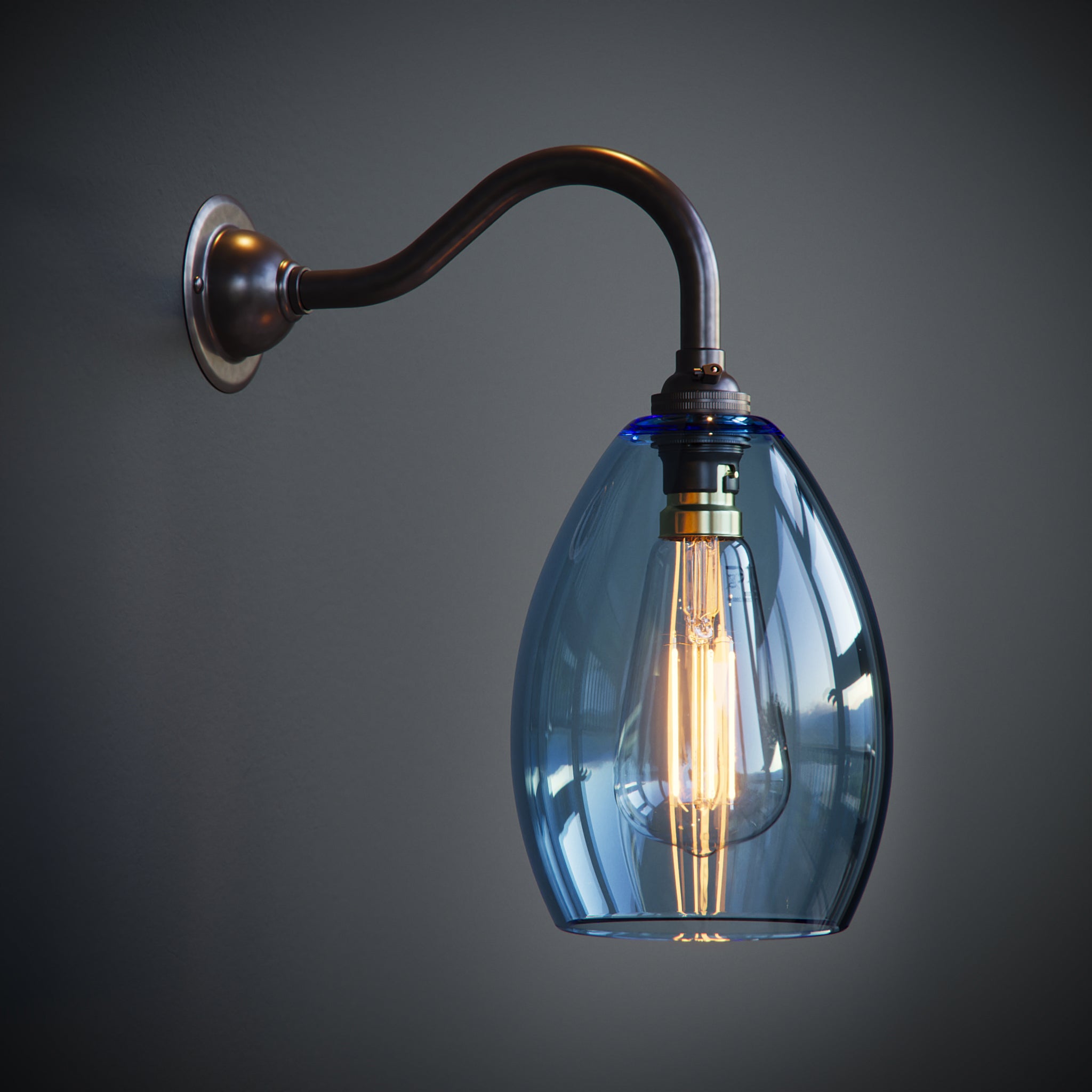 The Jules wall light features a handblown pale blue glass shade on a classic curved arm bracket. Available in small or medium, the soft blue glass adds a calm, uplifting touch to any room.
