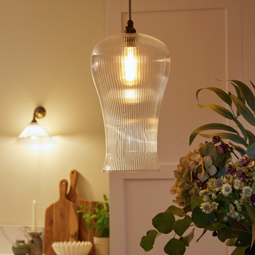 Fine ribbed glass pendant light | Handblown lighting UK | Kitchen island pendants | Customisable ceiling lights | British lighting brand | Made in Britain