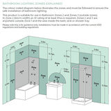 IP44 splash-proof, suitable for use in Zone 2 and Zone 3 (outside zones) of bathrooms.