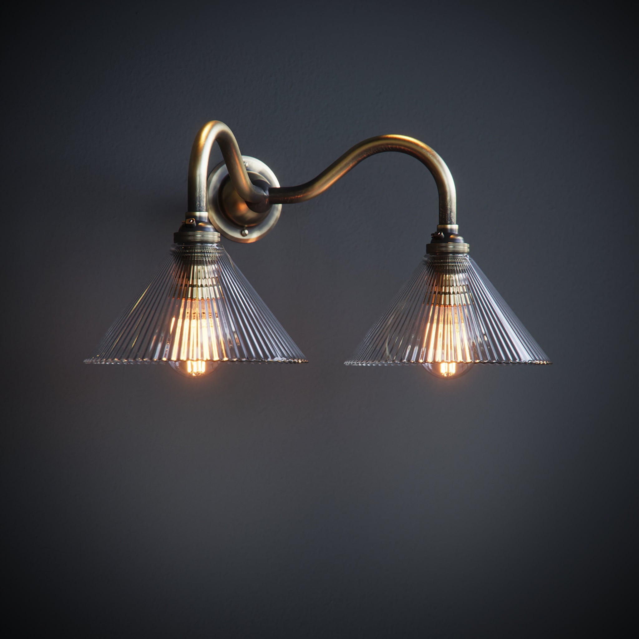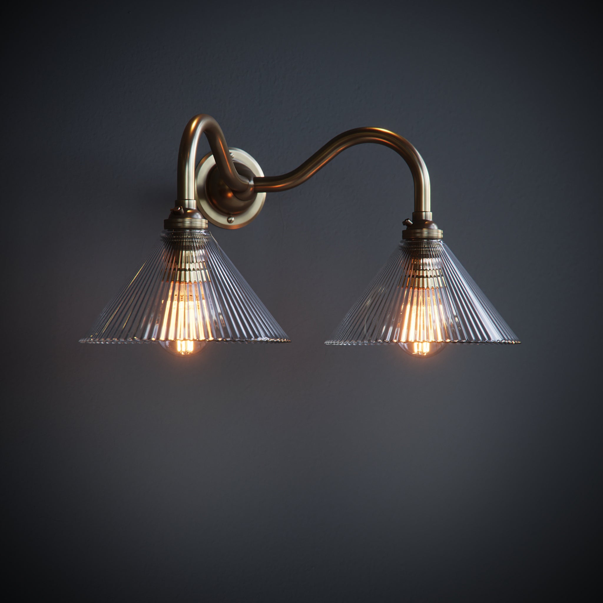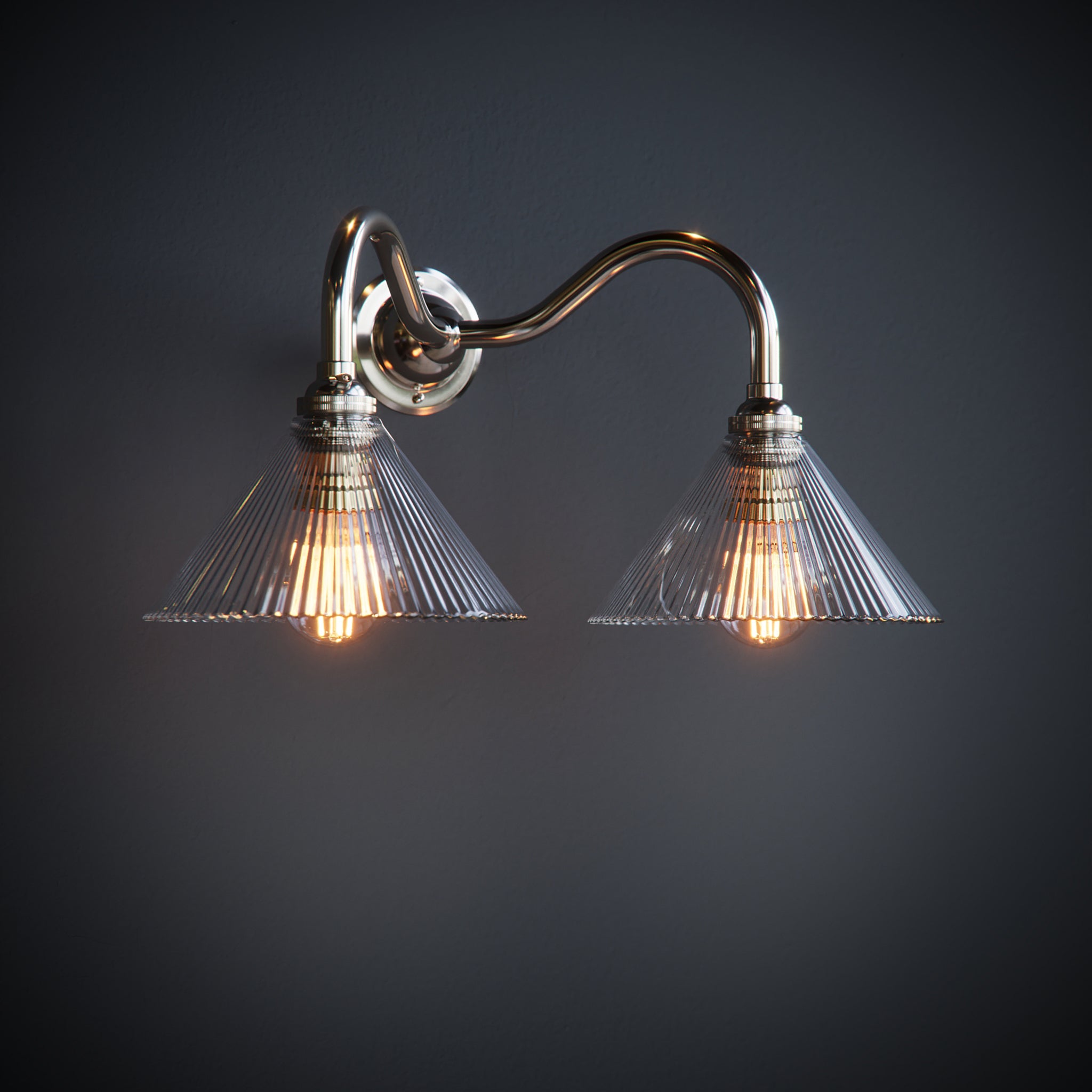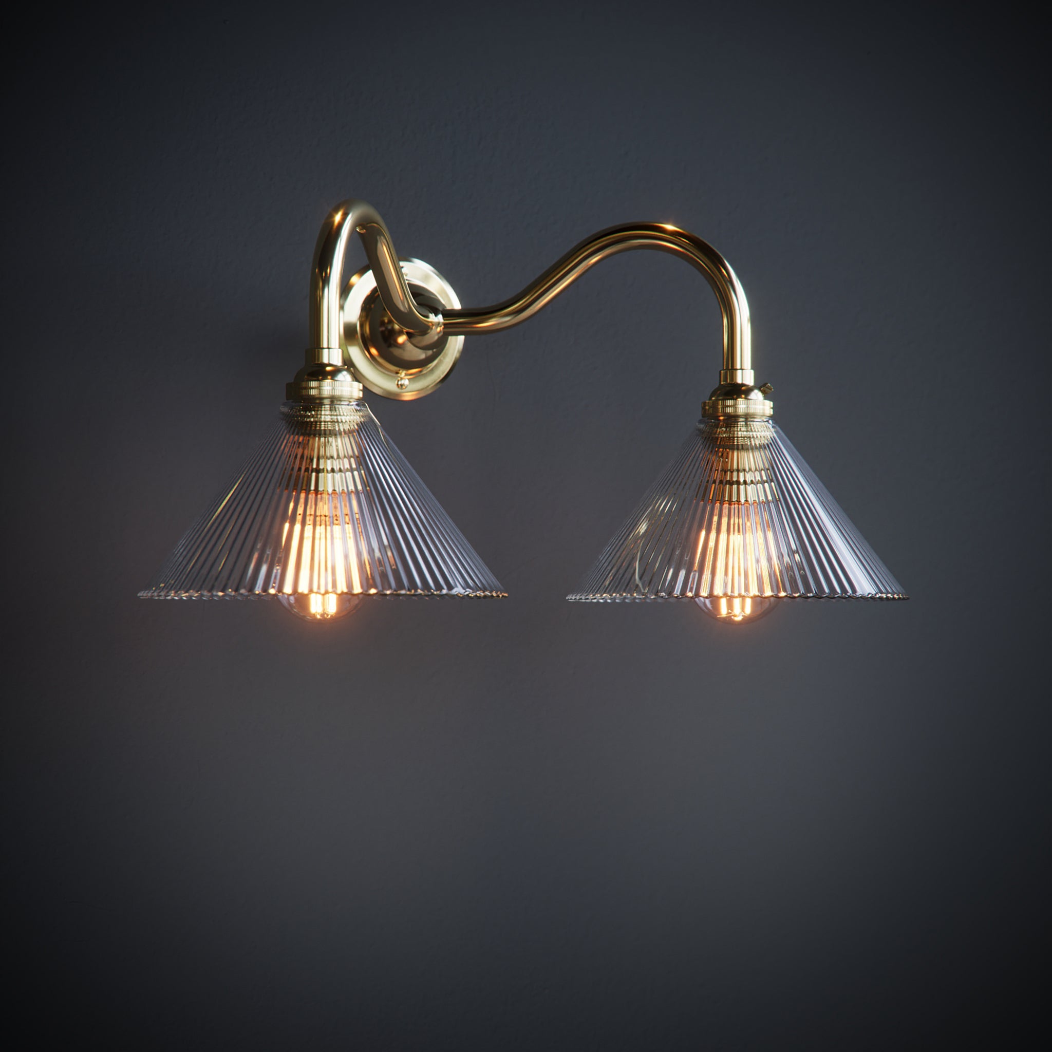 Introduce a burst of classic beauty to your home with our stunning Grace Clear Fine Ribbed Coolie Glass Double Wall Lights.