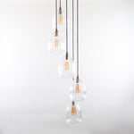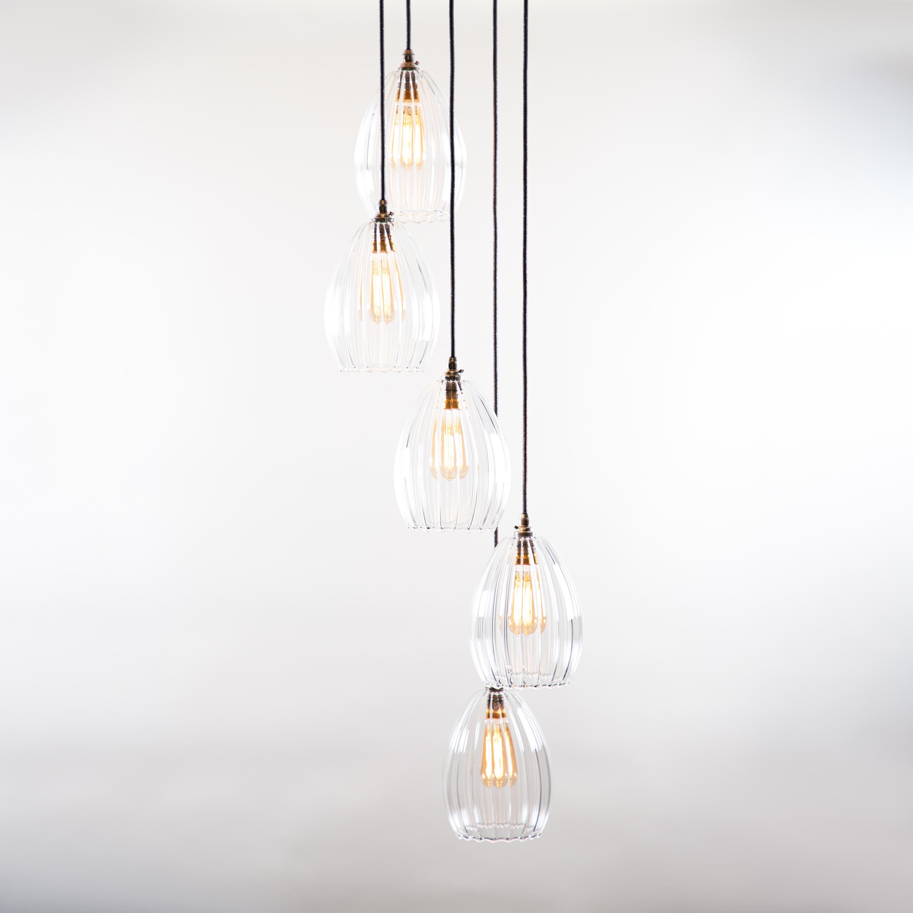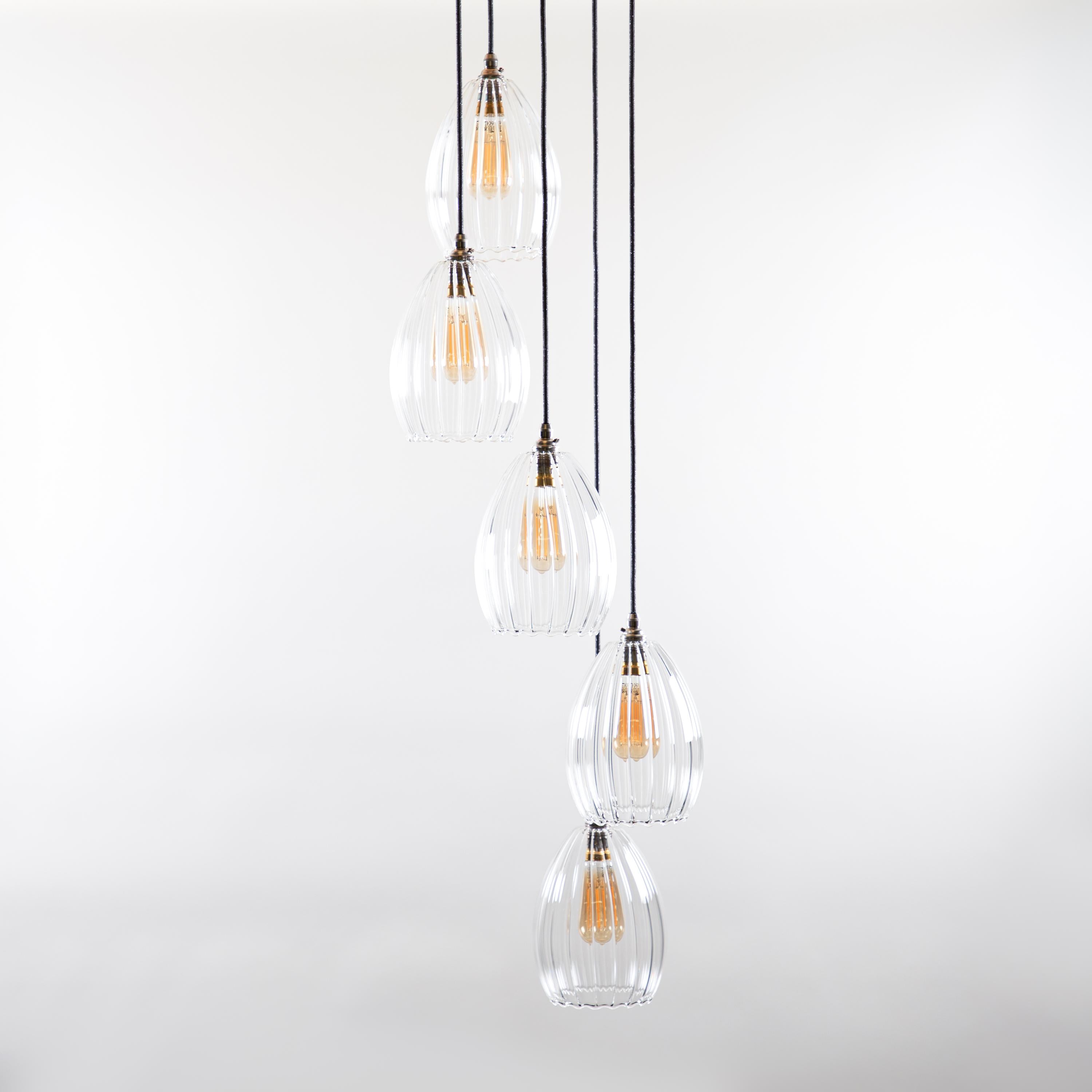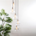 The Medium Jules Clear Ribbed Glass Cluster Chandelier features five beautifully handblown glass shades, suspended from a larger ceiling plate to create a striking pendant light ideal for stairwells, hallways, and dining areas.