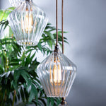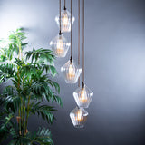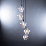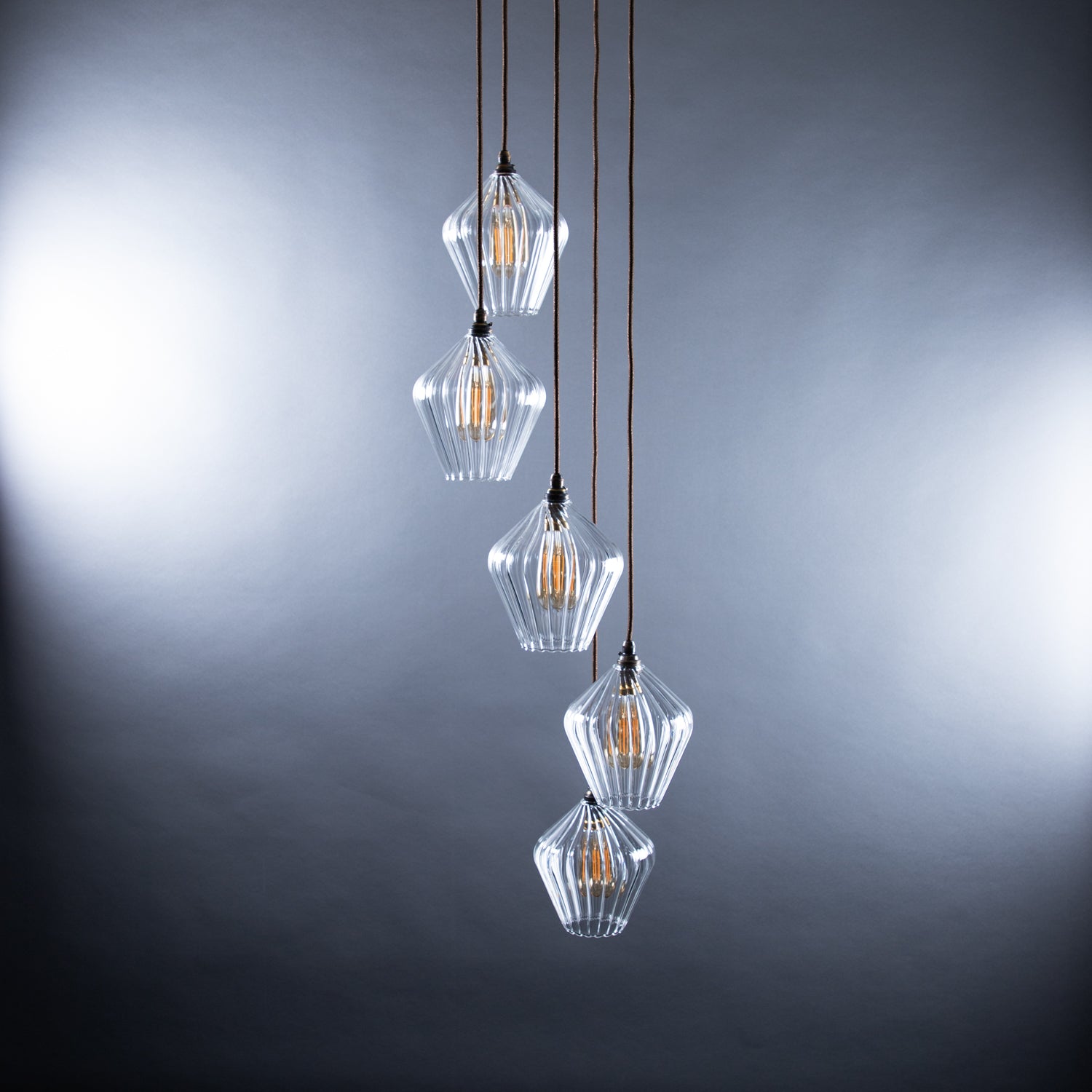 Our cluster chandelier of five standard Olive clear ribbed glass hand-blown shades. Our cluster pendant ceiling light shades look simply stunning in a hallway or over a staircase, and would undoubtedly brighten up your dining area.