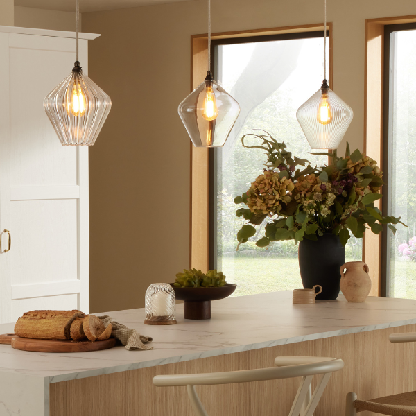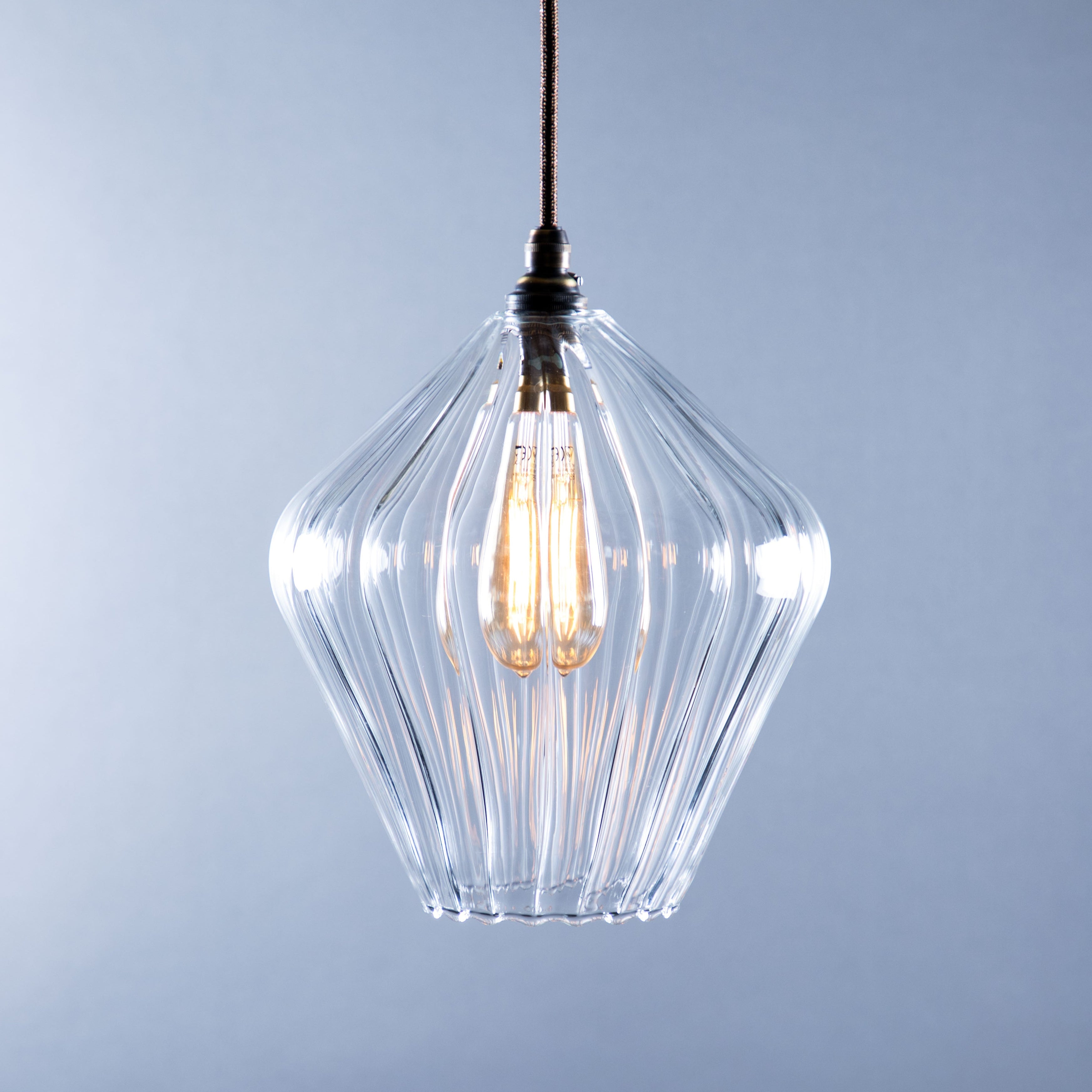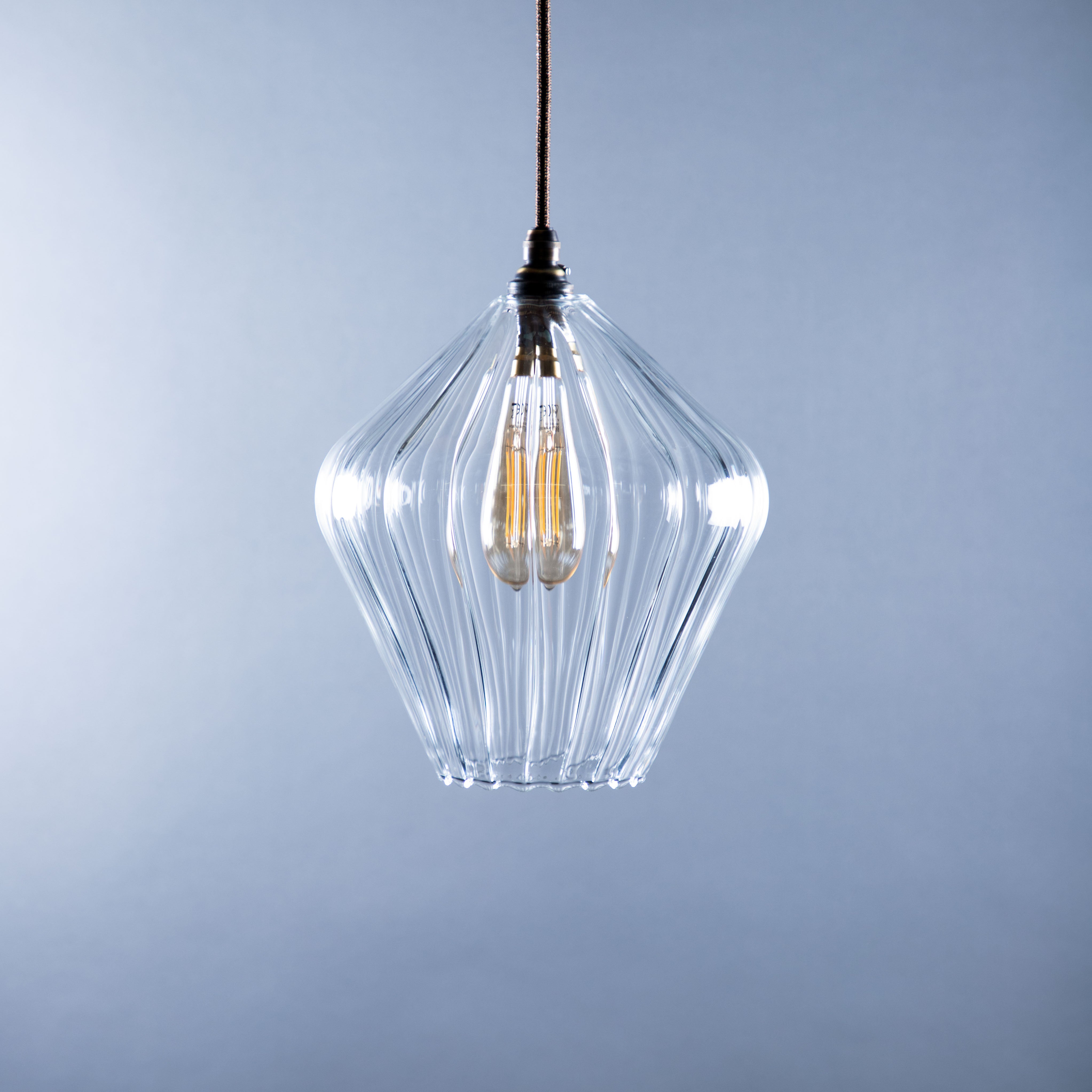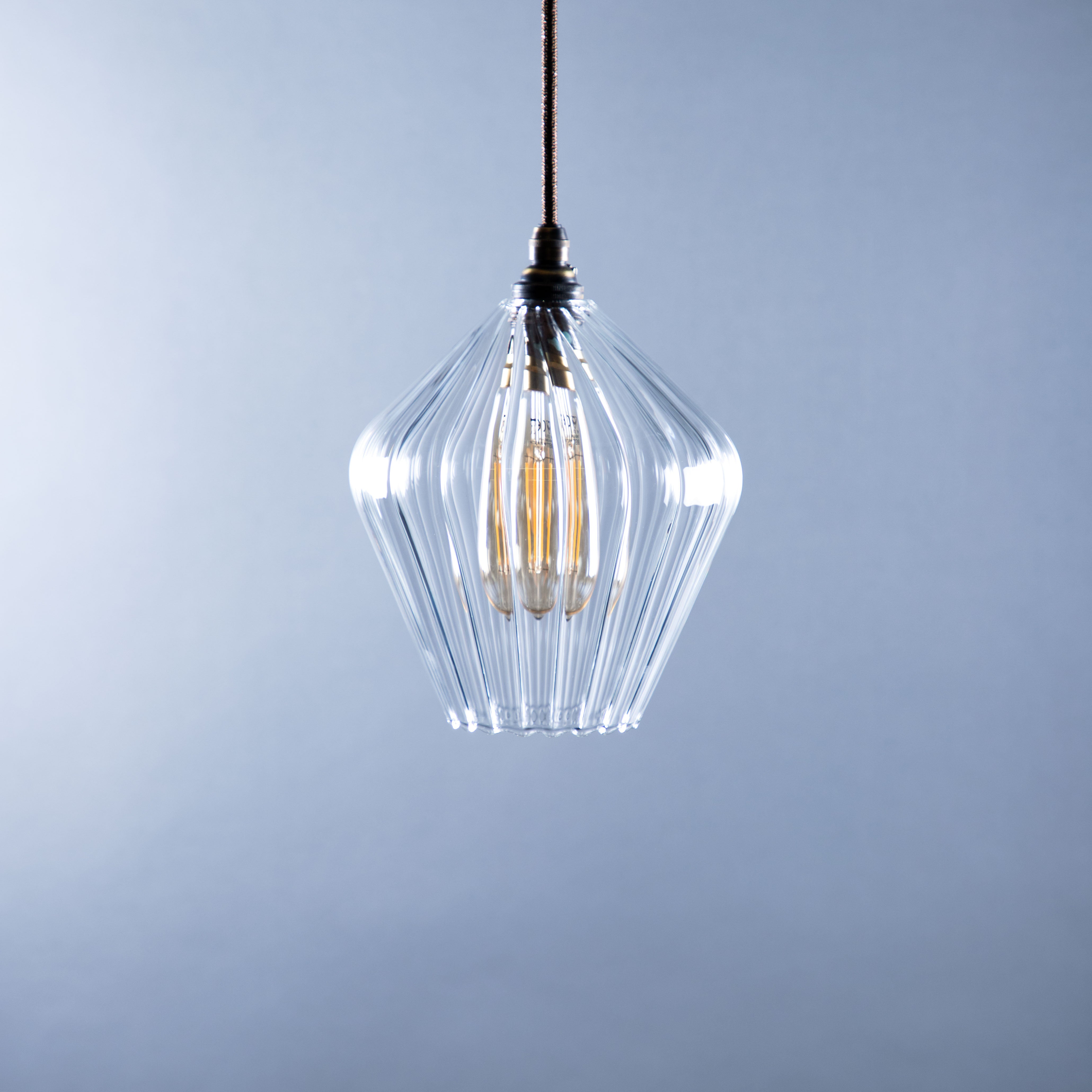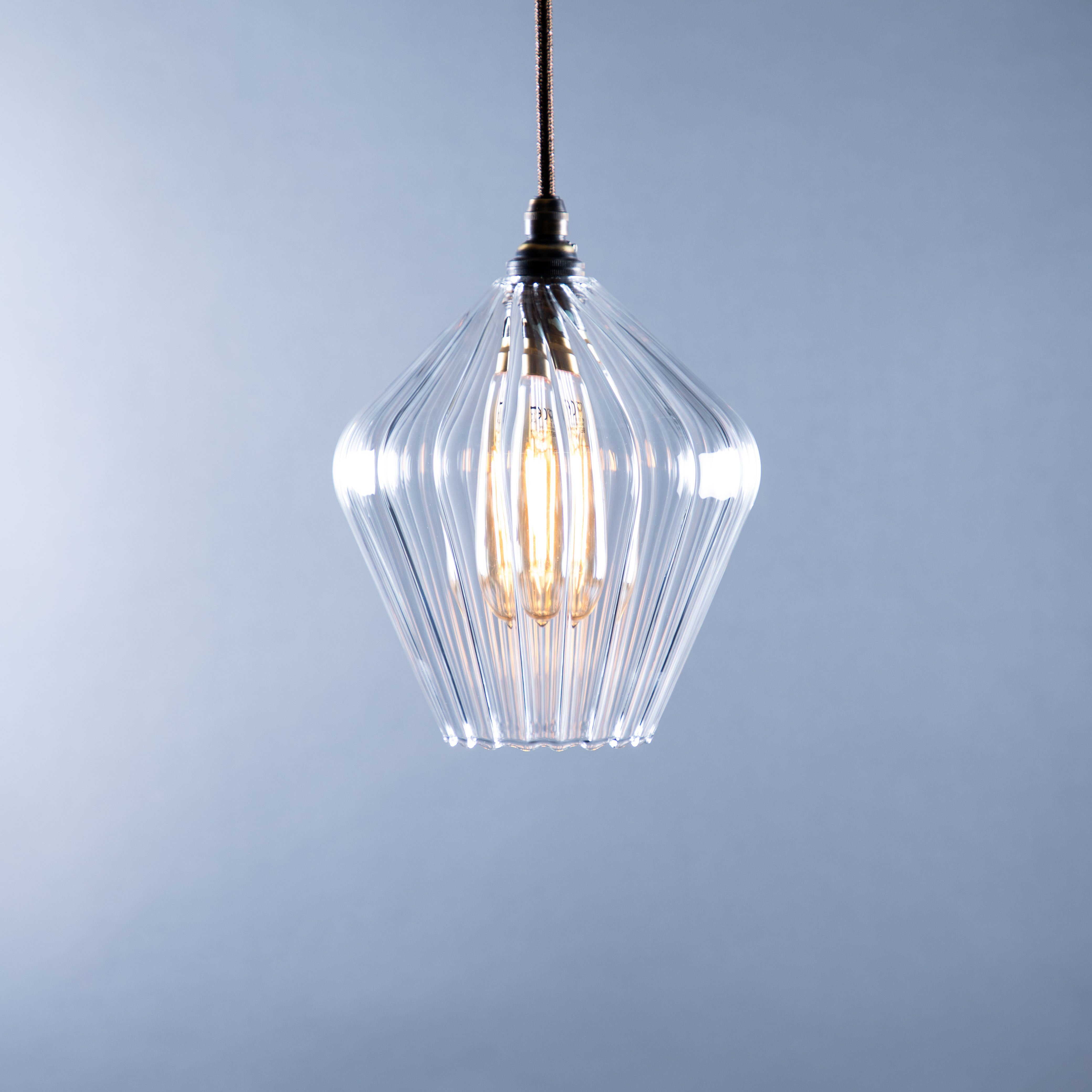 The Olive pendant light is handblown in our Glow Glass Blowing Studio and features clear ribbed glass and showcases the best of British craftsmanship. Each piece is uniquely made, celebrating creativity and artisan skill.