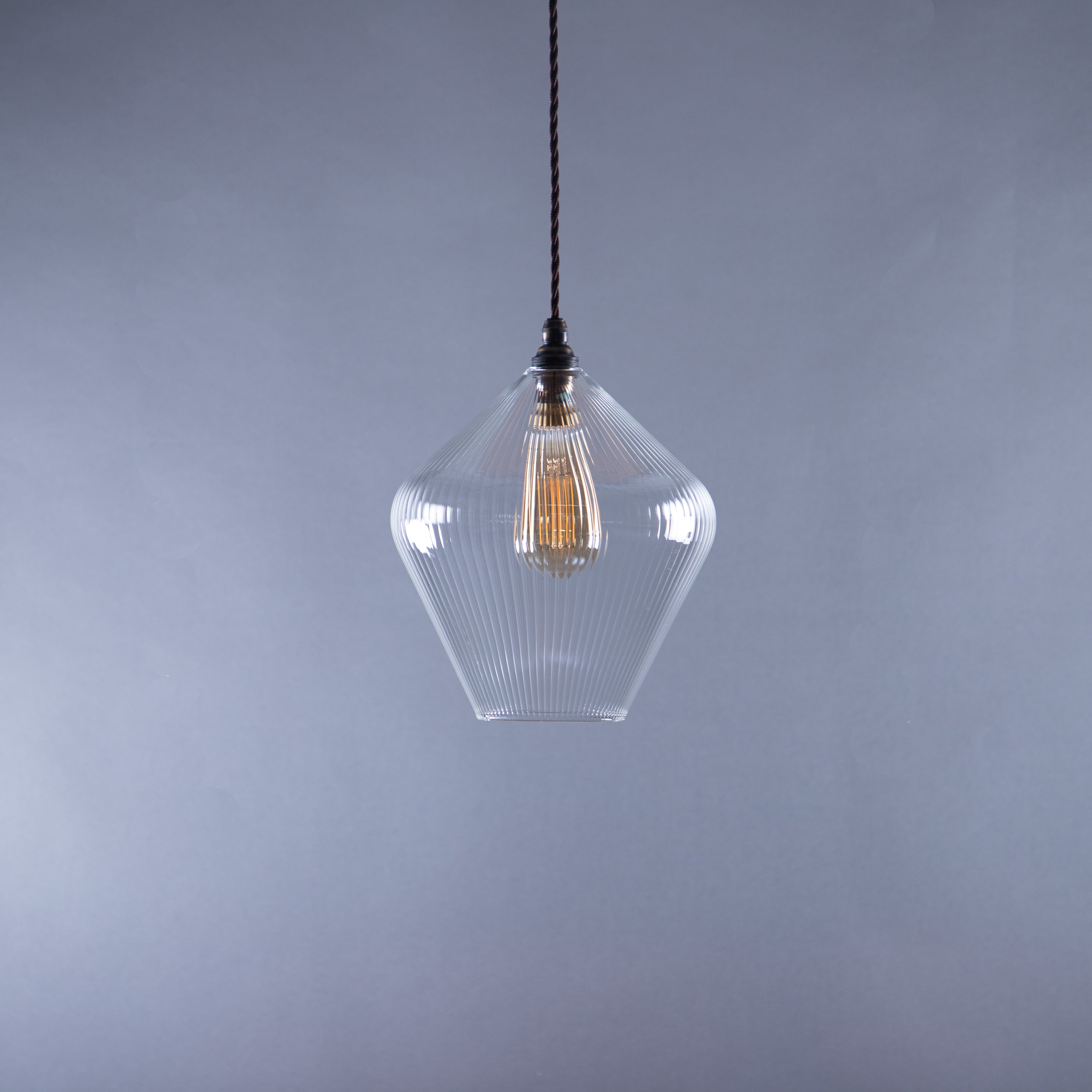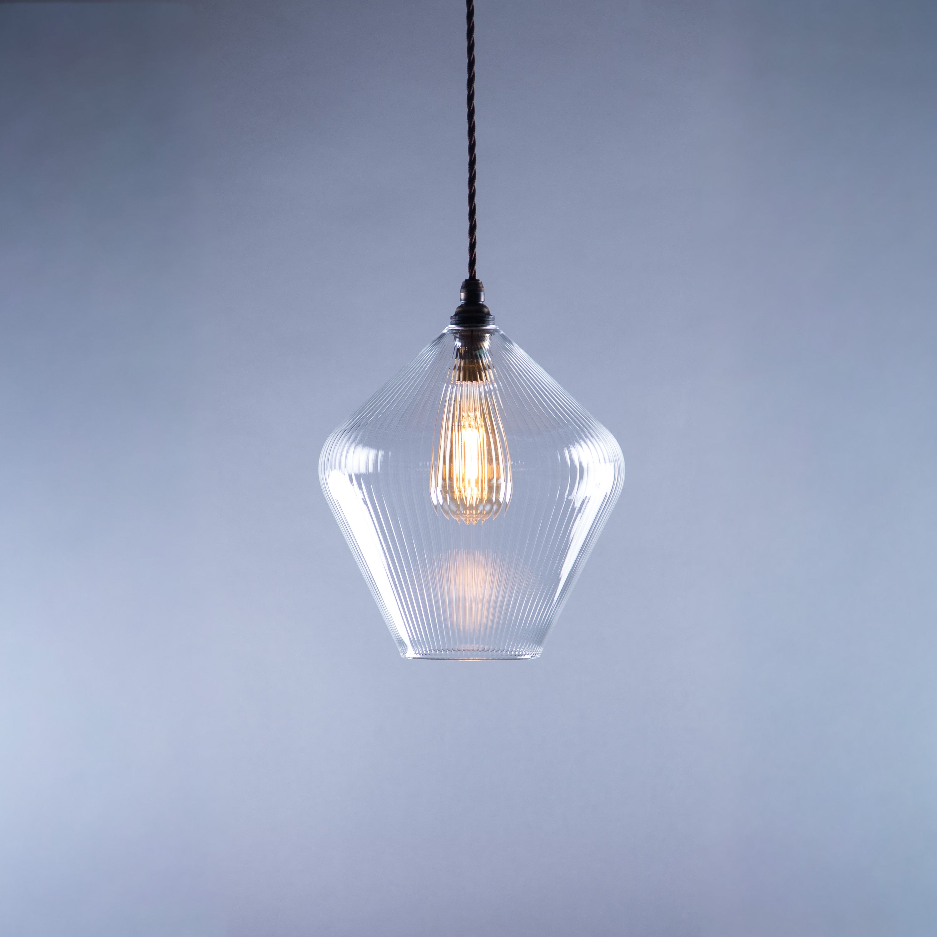 The Olive fine ribbed pendant light is handblown in our UK studio and showcases a distinctive soft diamond silhouette with delicate ribbed glass detailing. Elegant and timeless, this artisan pendant brings both texture and sophistication to your interior.