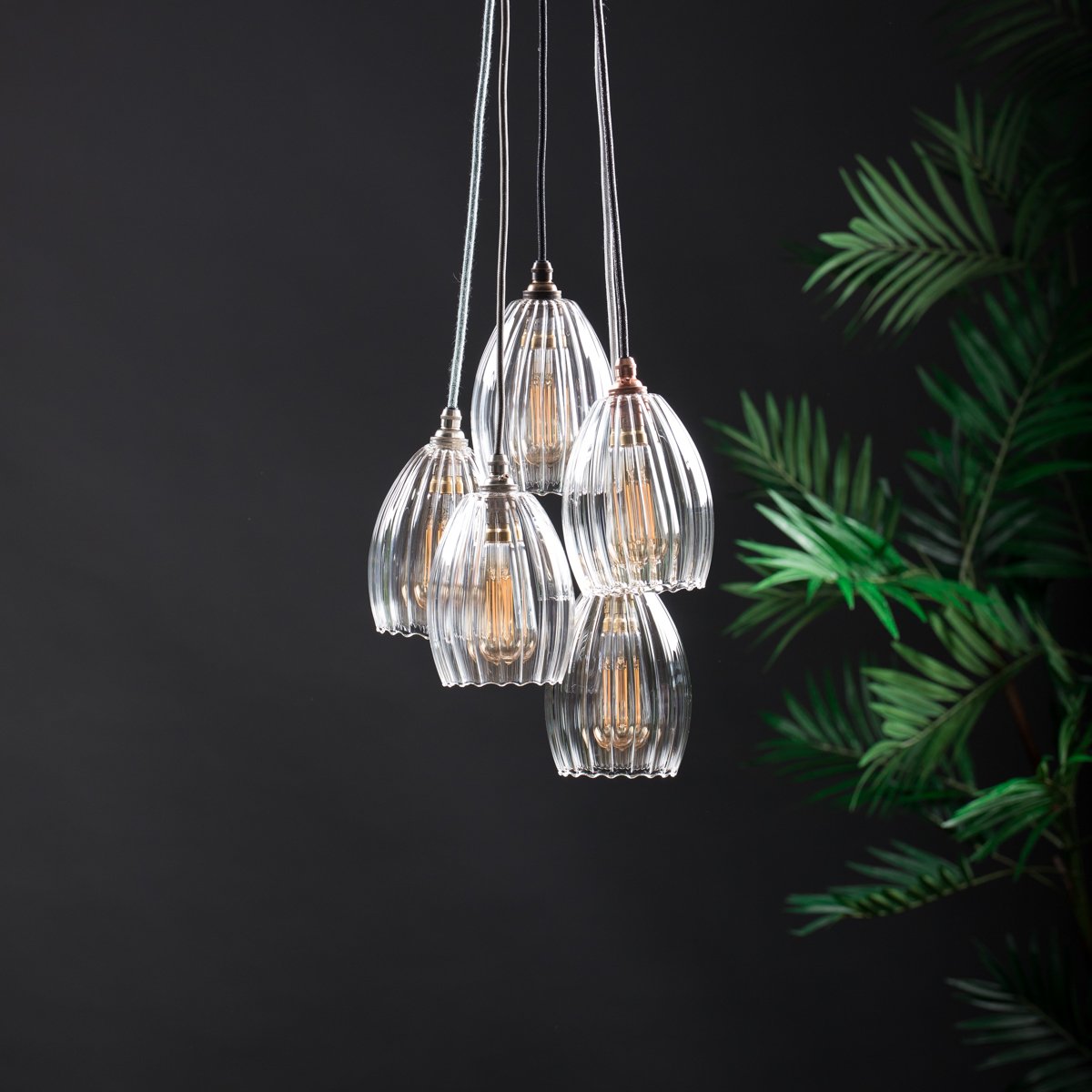The softly curved ribbed glass creates subtle texture and a beautiful diffusion of light, making it equally suited to modern and traditional interiors. Each shade is suspended from high-quality fabric cable, and the cluster can be arranged at equal or staggered heights for the look you want.