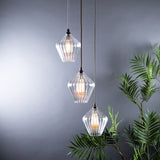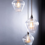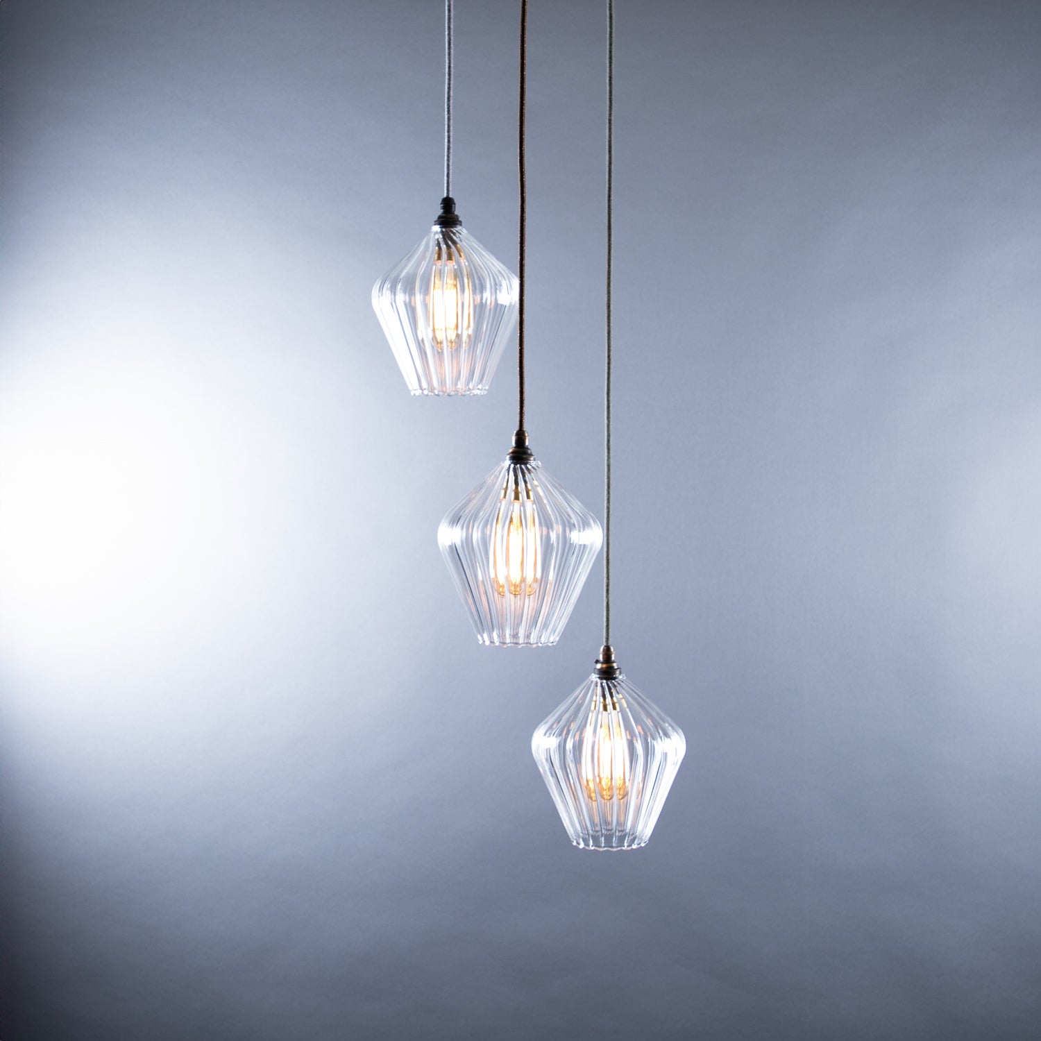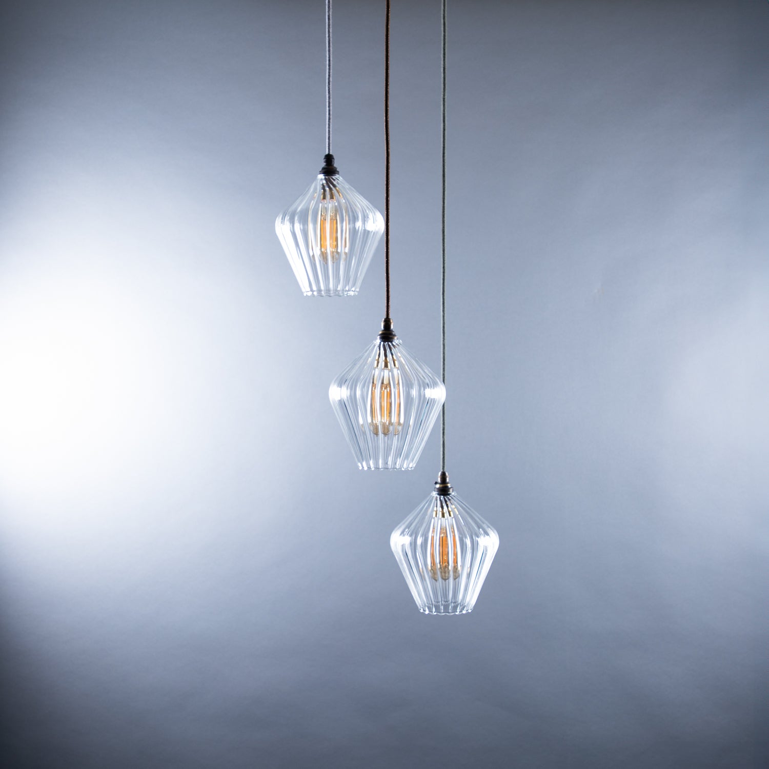 Our crystal clear glass shades , handblown in our in-house glass blowing studio, hung in a trio configuration look impressive in a hallway or over a staircase, and would certainly liven up your dining area.