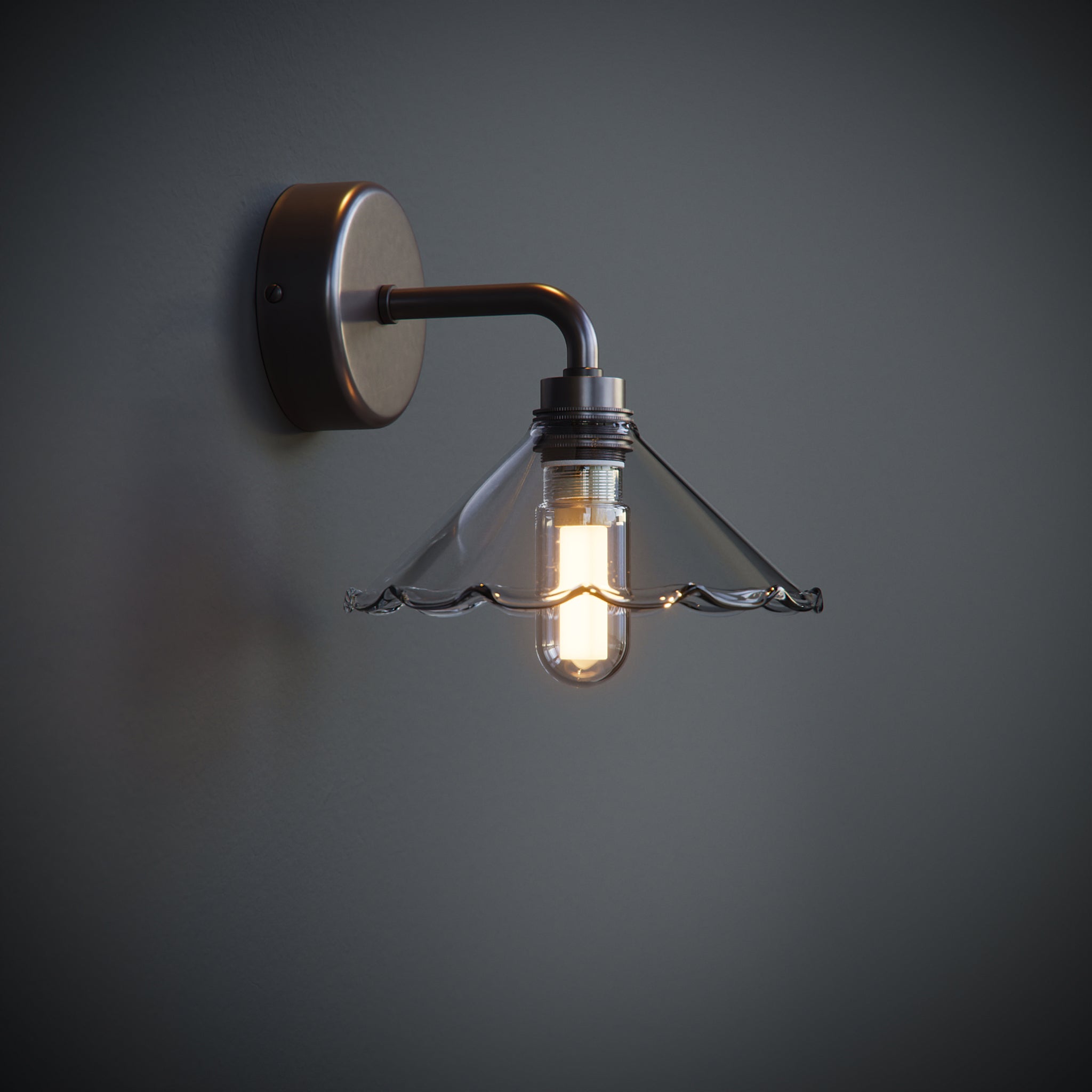 Glow designed and handcrafted in the UK, the Florrie IP44 Bathroom Wall Light combines vintage styling with artisan glassmaking. Its handblown clear glass coolie shade features a softly frilled edge and elegant fluted detailing, creating a distinctive design with timeless appeal.