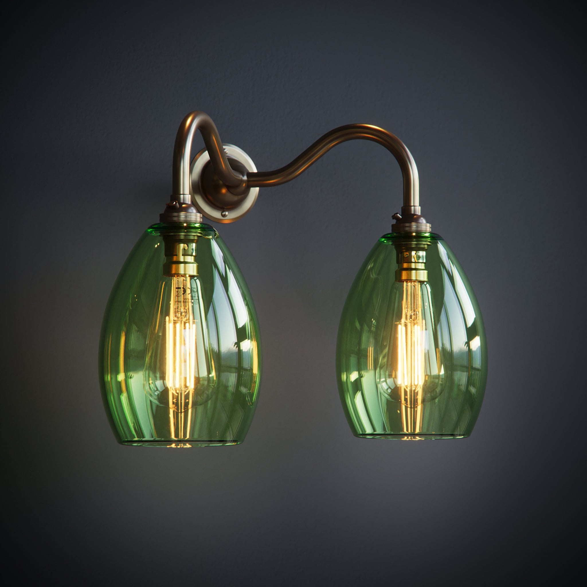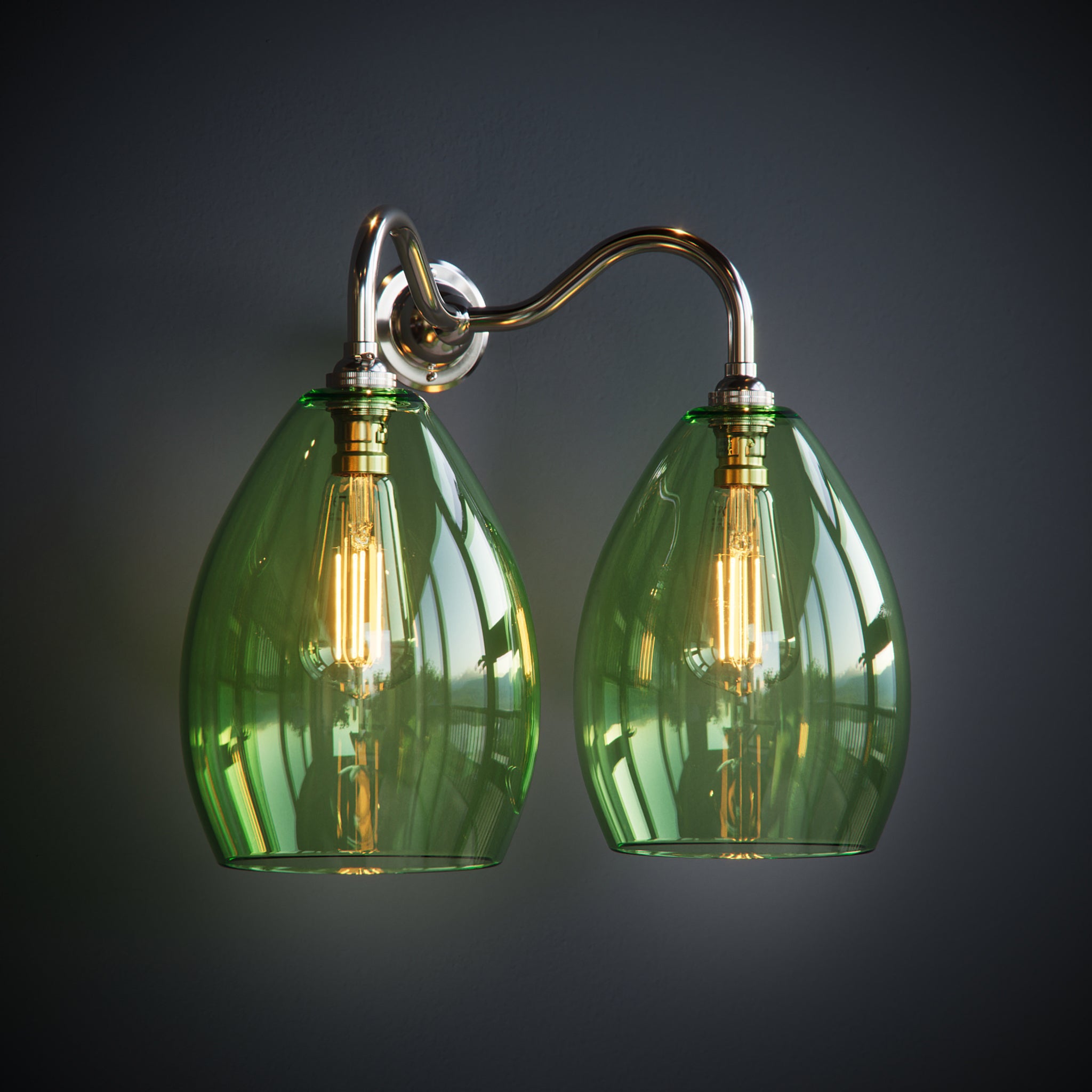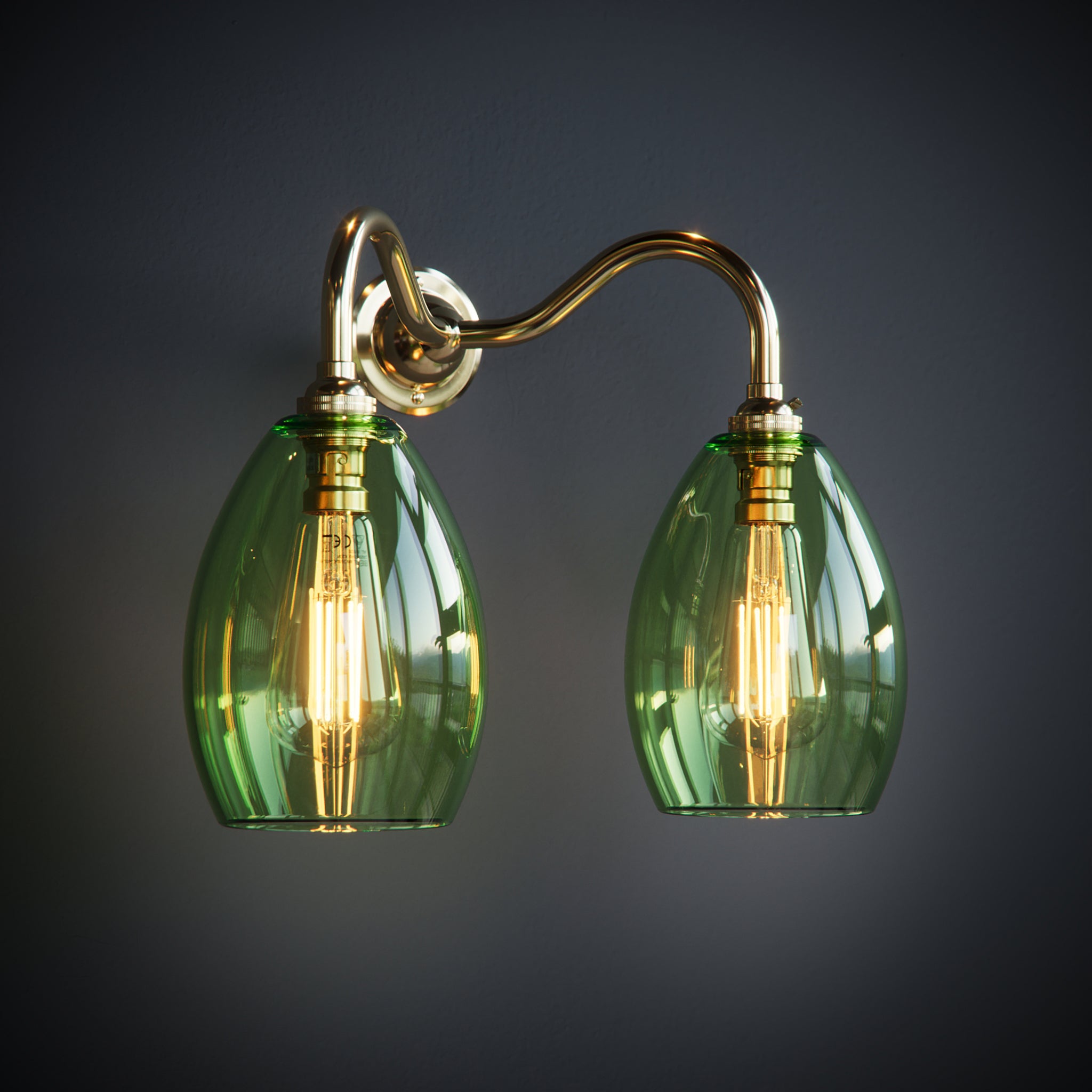 Add bold colour and beauty to your home with the Jules Double Wall Light in lime green glass. Handblown in our Yorkshire studio, each shade is crafted with precision and mounted on a classic curved double-arm design, bringing both symmetry and style.