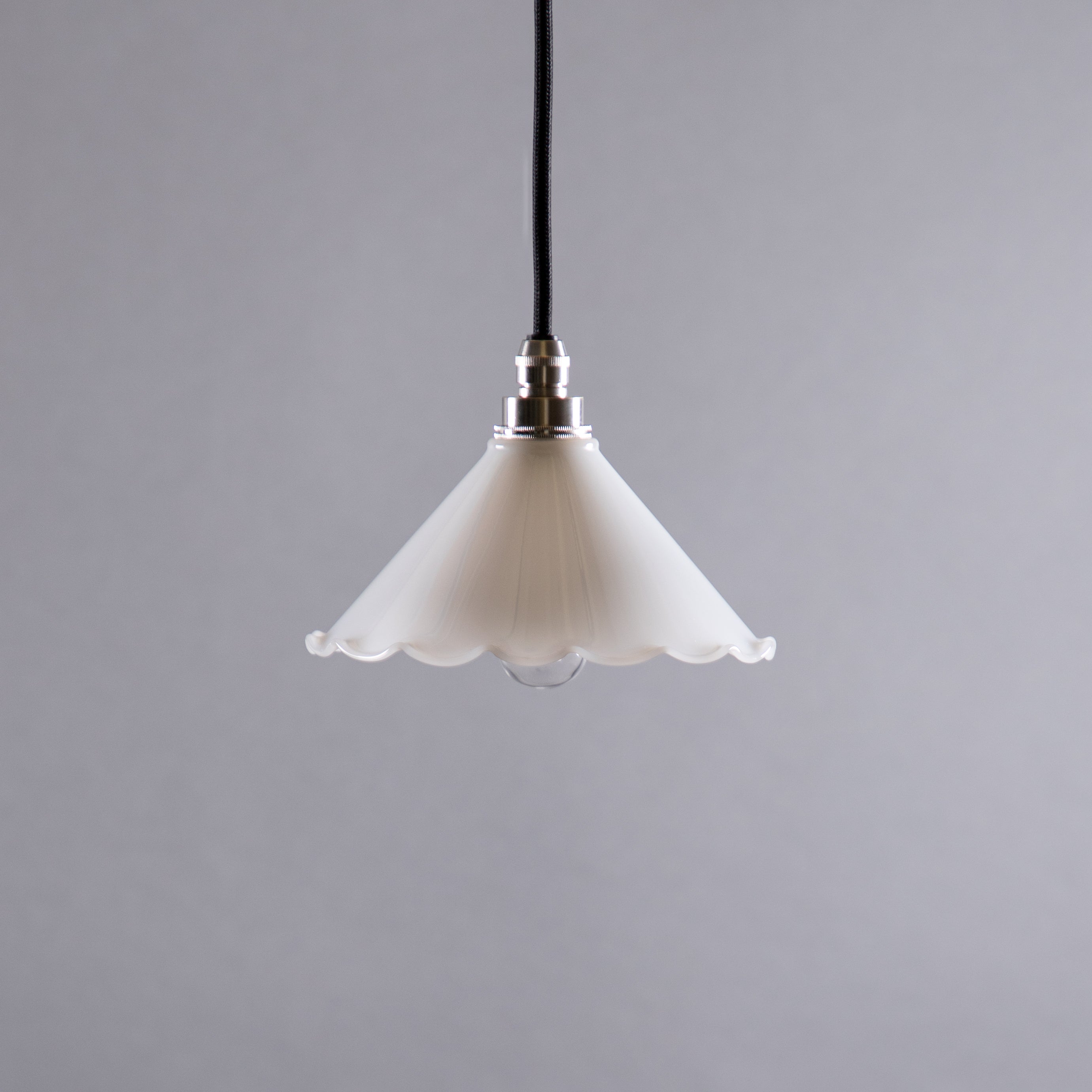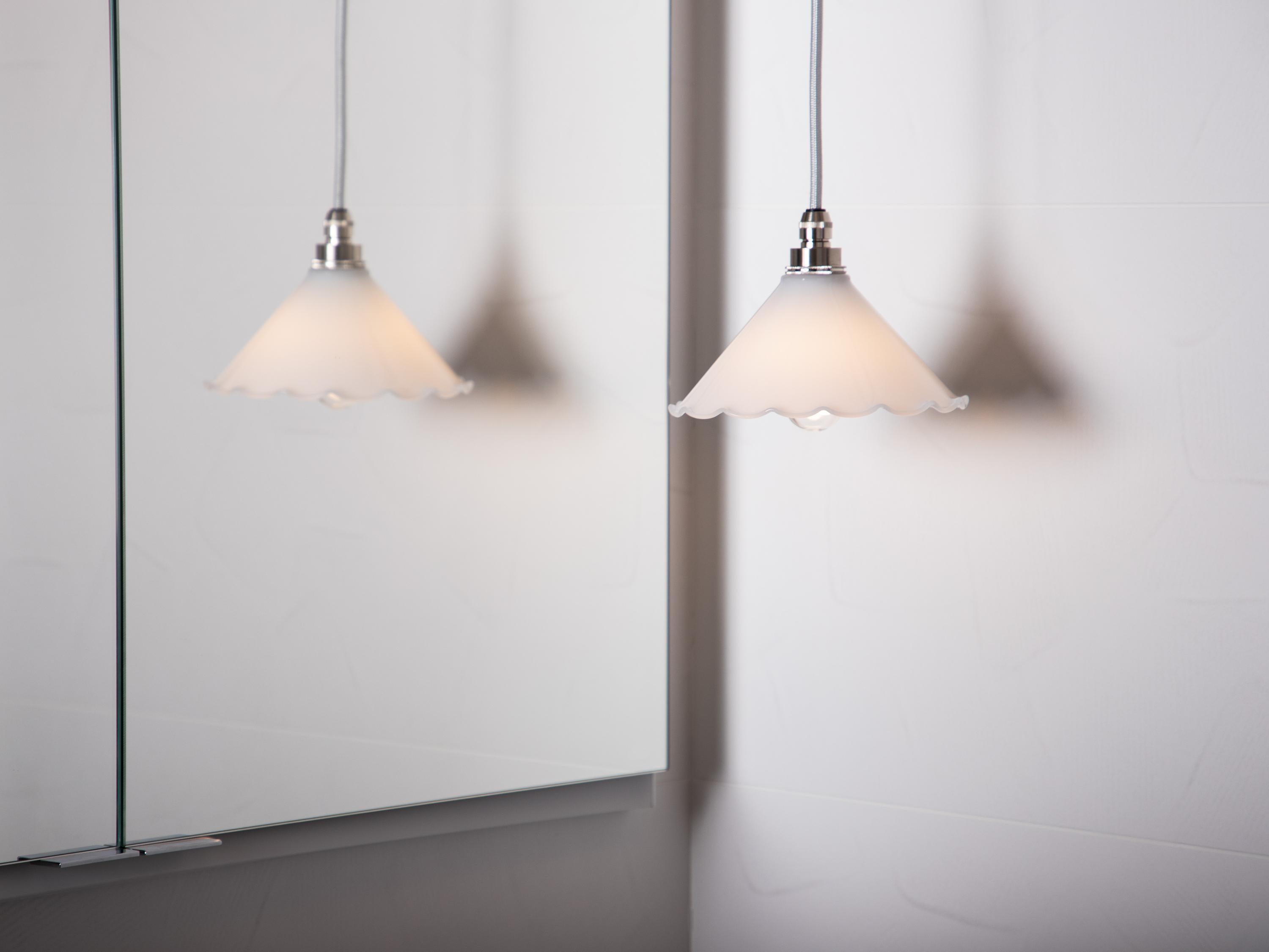 Glow designed, IP44 bathroom pendant lights. Our Florrie frilled opal opaque glass coolie shade is handblown in the UK. The retro fluted style of this shade denotes is charm. Available in a brushed brass or brushed nickel finish adding charm to modern or traditional interiors alike. Comes complete with G9 dimmable warm white capsule lamp. All our lighting is assembled in Ripon from the finest components, which are made locally wherever possible.