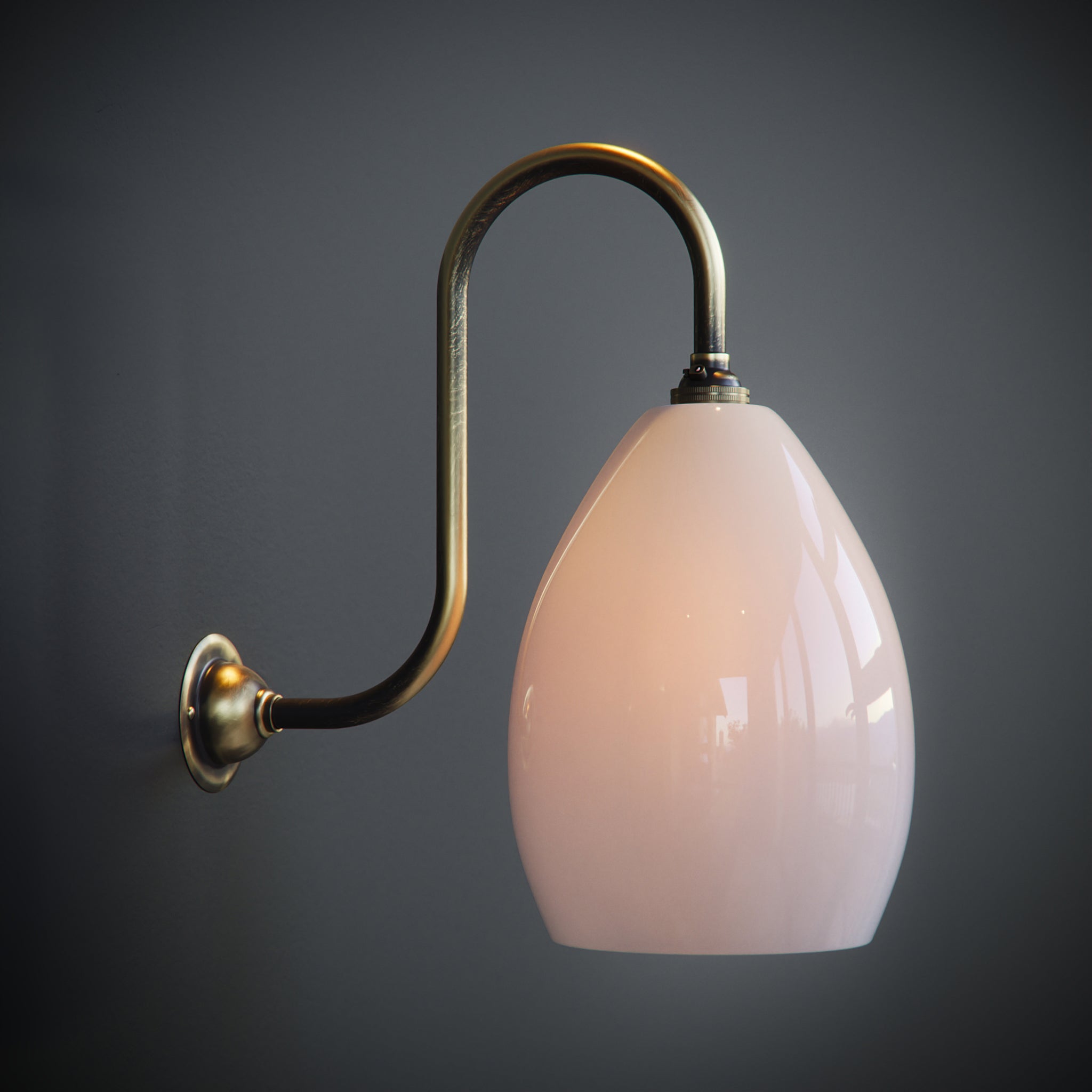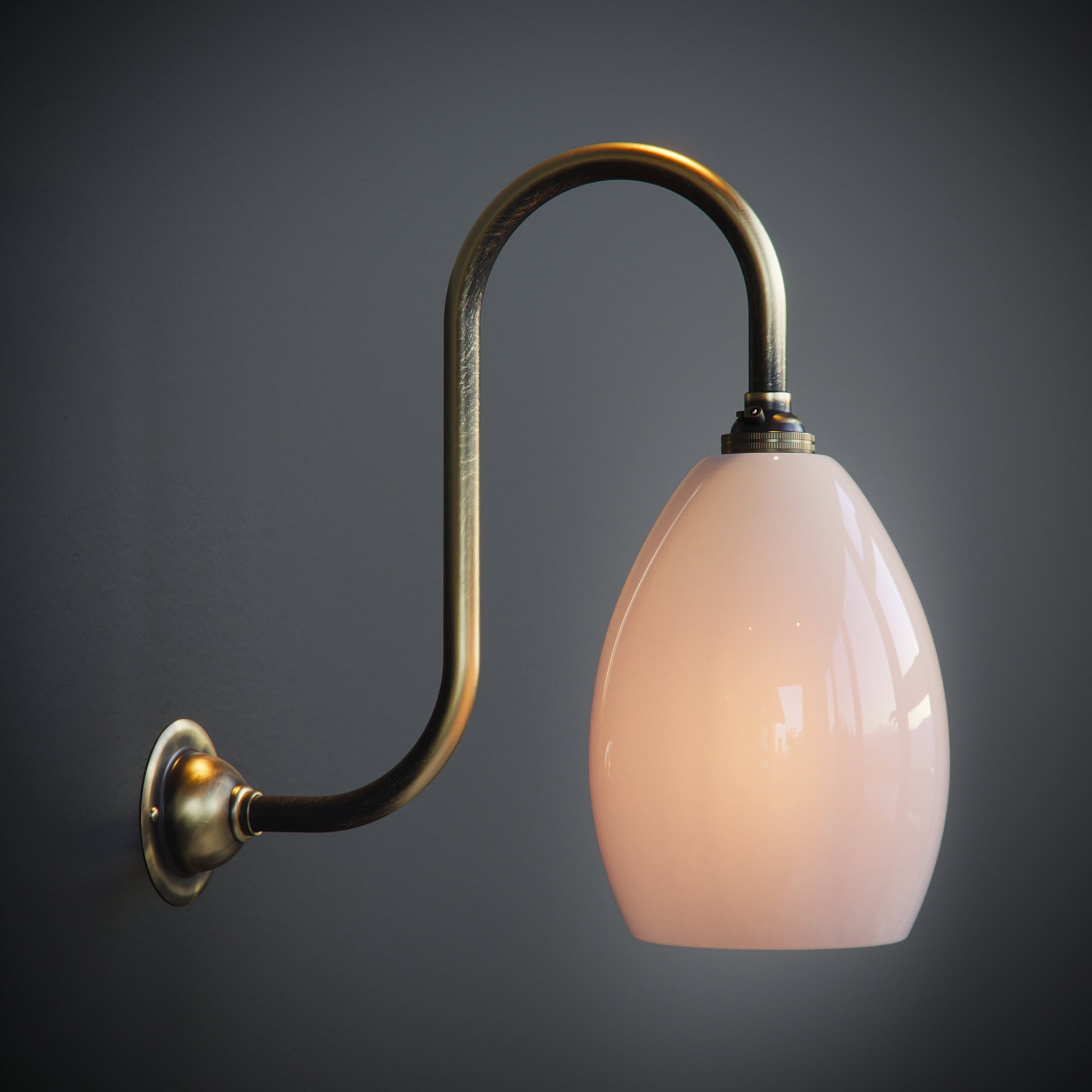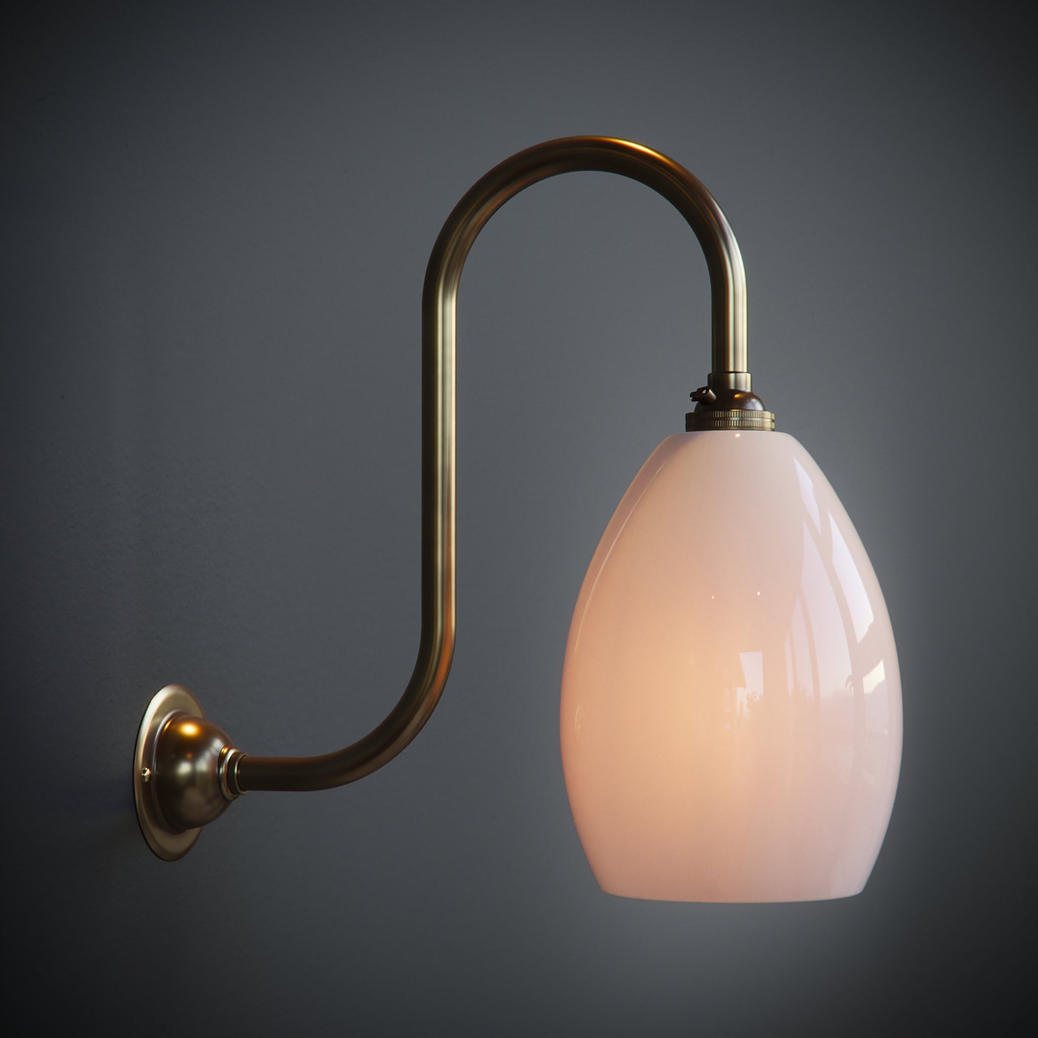 Handblown in our Yorkshire studio, the Swan Neck Olive Wall Light in opal glass is a timeless design that combines artisan craftsmanship with understated elegance. The softly diffused glow from the opal glass shade creates a warm, inviting atmosphere, perfect for both modern and traditional interiors.