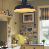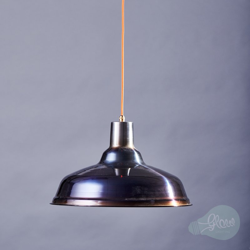Dimensions: 370mm diameter, 220mm height, steel factory pendant c/w British made B22 lamp holder and a 66mm or 80mm diameter ceiling rose, supplied with one metre fabric cable as standard. Also available in a larger size, see Lenny Large.
