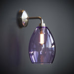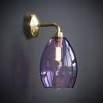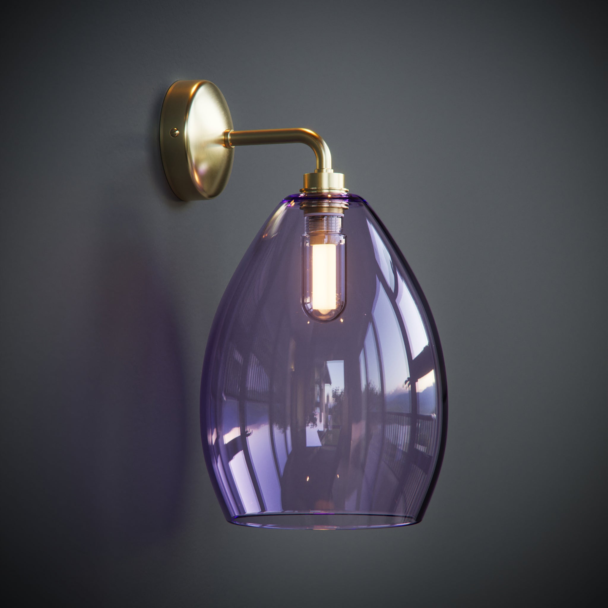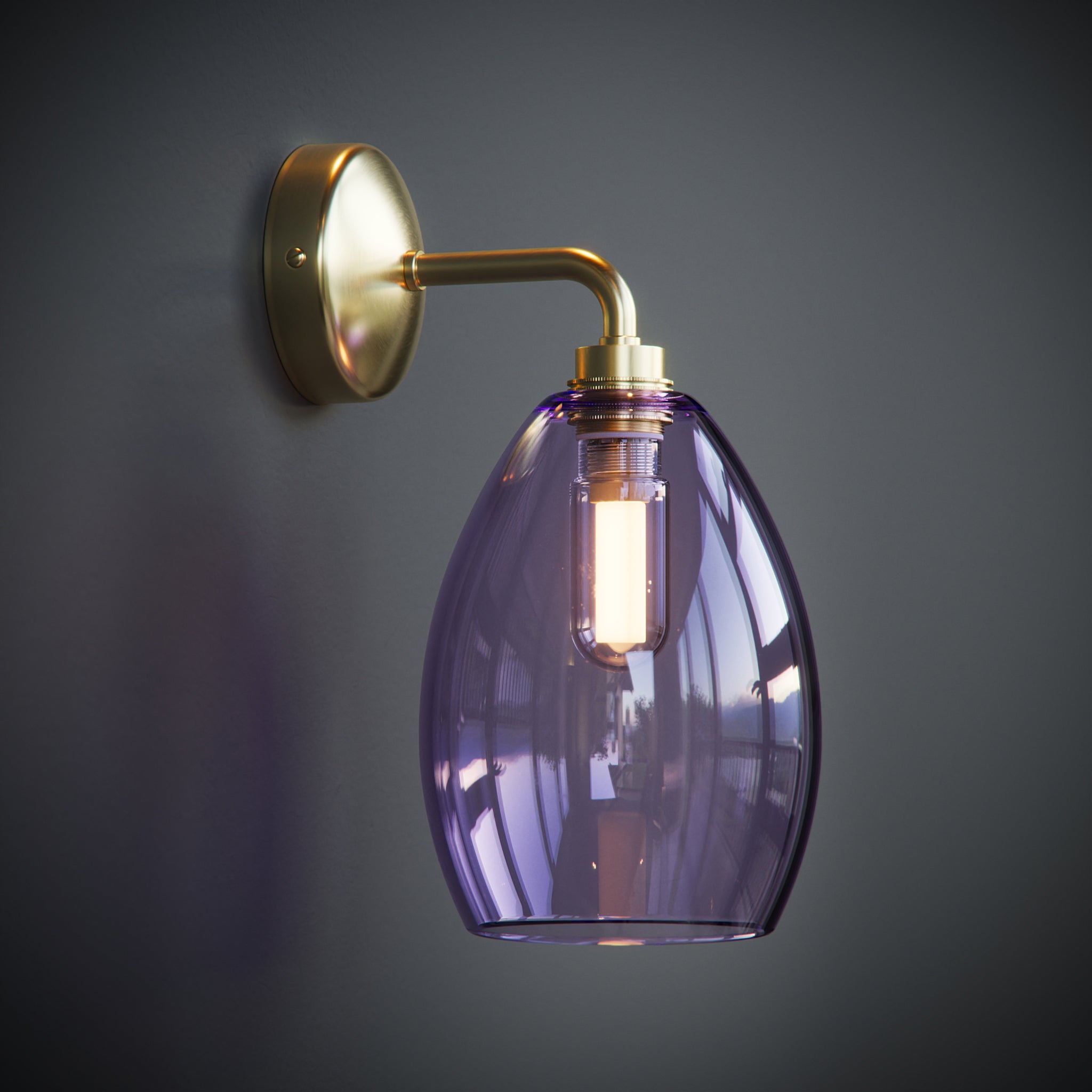 Glow designed, IP44 rated bathroom wall lights. Our luxurious lilac glass shade creates a luscious, relaxing Glow in your bathroom, adding a touch of simple elegance to your interiors. Hand Blown and made in our Glow glass blowing studio. Available in brushed brass, brushed nickel, antique brass or bronze, perfect for traditional and contemporary interiors alike.