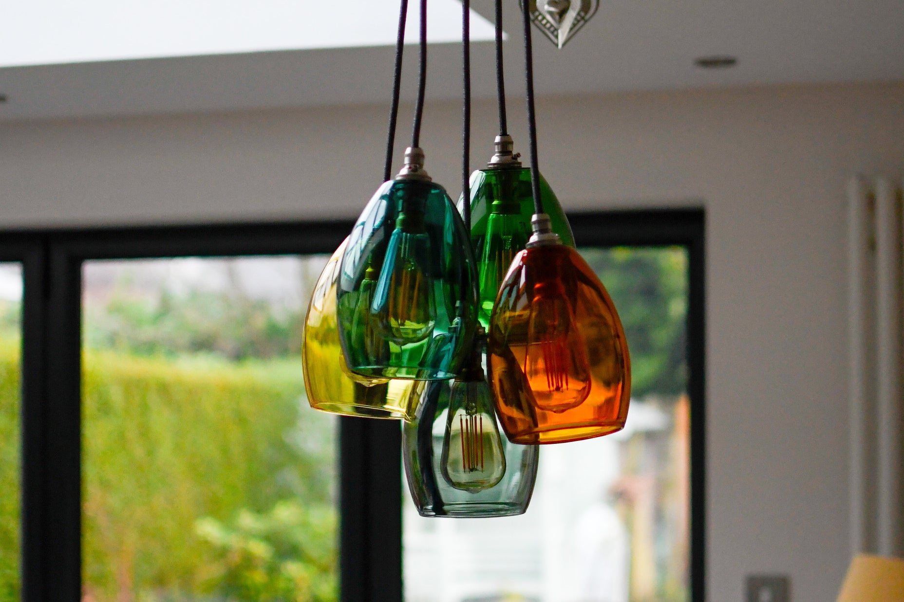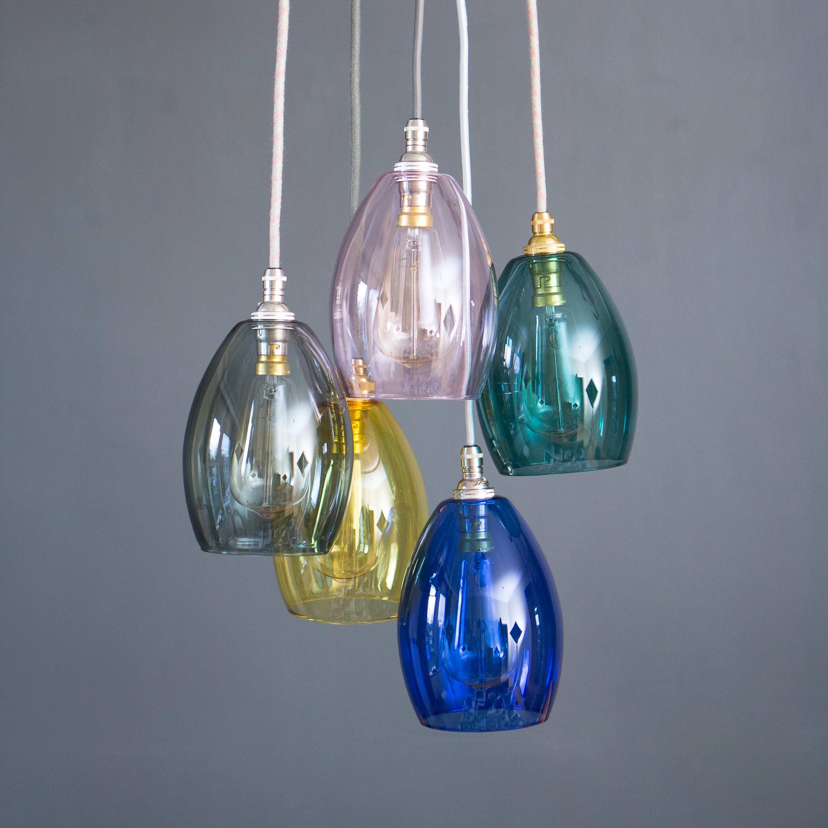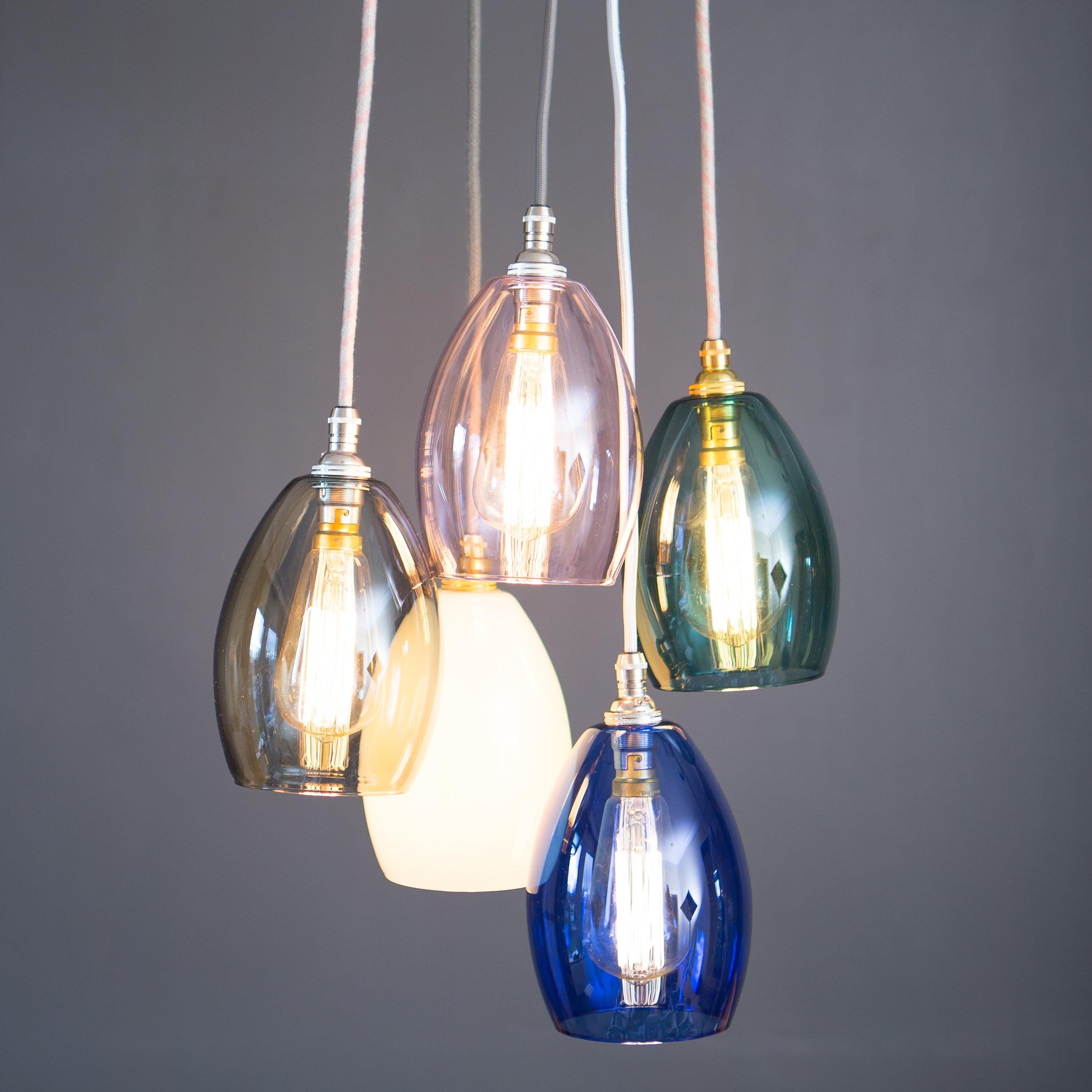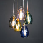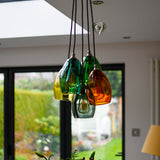 Our hand blown 5 way Jules small shade coloured glass cluster chandelier pendant light, embrace a symphony of colours and craftsmanship that redefine your interior.